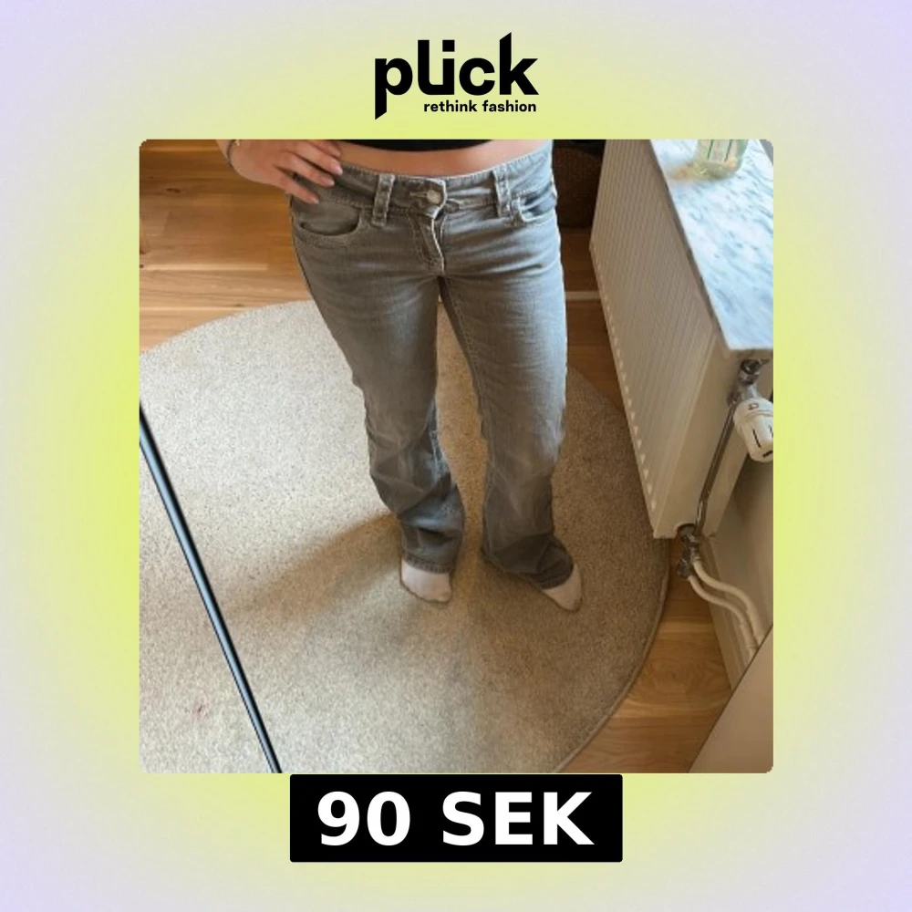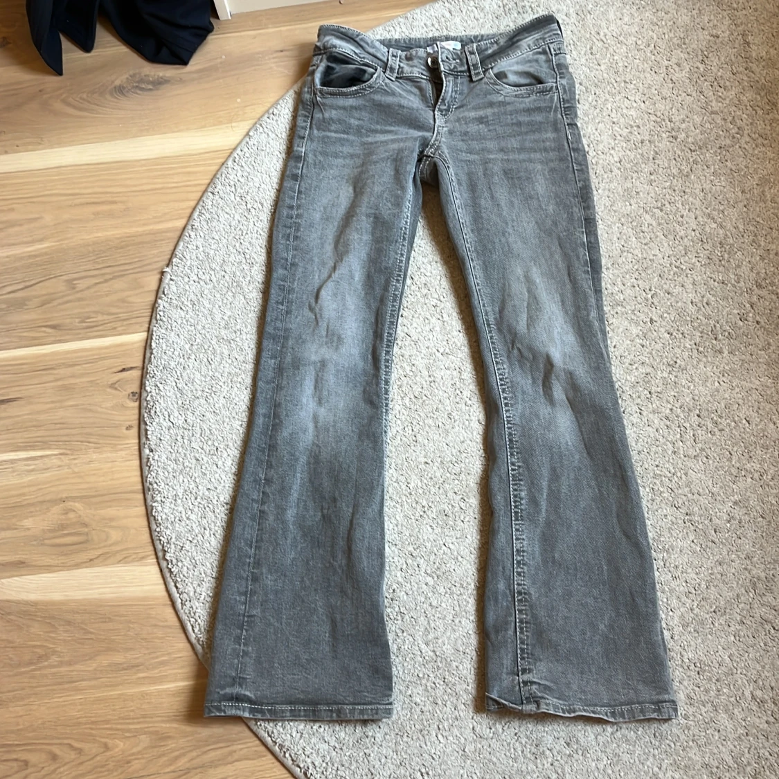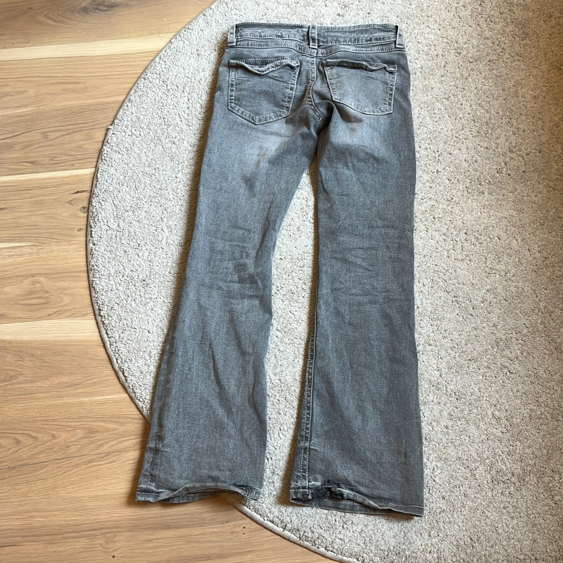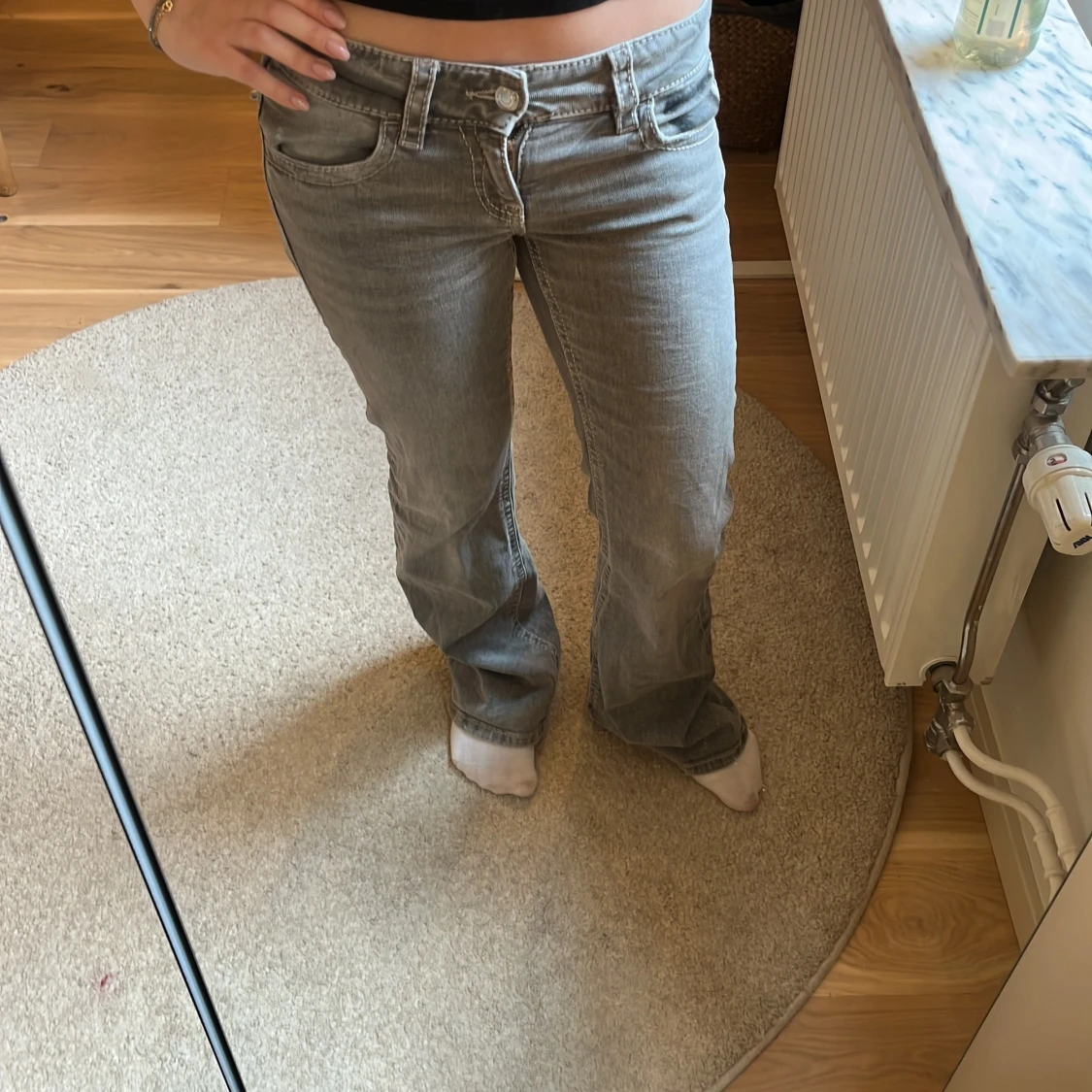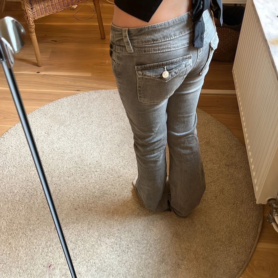 Säljer ett par grå bootcut jeans med låg midja och klassiska fem fickor. Jeansen har en snygg tvätt och stängs med dragkedja och knapp. Perfekta för dig som gillar en retro vibe och vill ha ett par jeans som sticker ut lite.