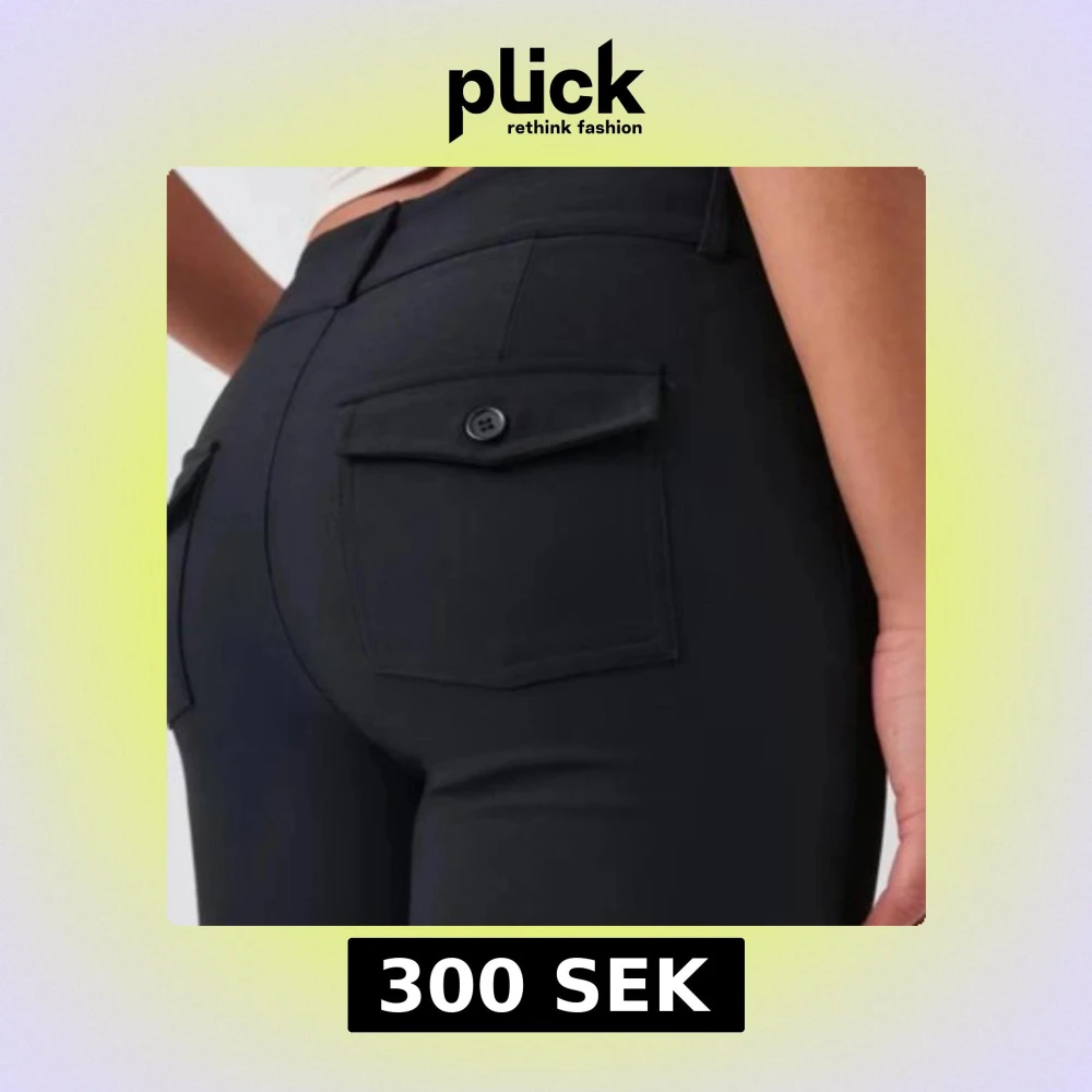 Snygga svarta kostymbyxor med bootcut passform och låg midja. Byxorna har två knappar framtill och vida ben nertill. Fickor på rumpan. Perfekta att styla med en enkel topp eller kavaj.