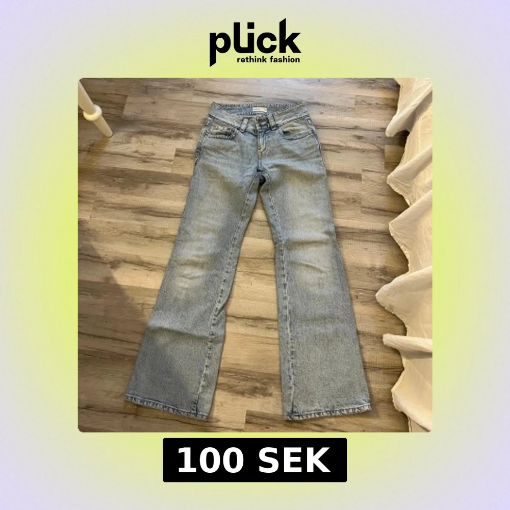 Säljer ett par ljusblå jeans med bootcut-modell och snygga fickdetaljer bak. Jeansen har klassisk femficksdesign, bälteshällor och dragkedjegylf. Perfekta för dig som gillar en retro vibe och vill ha ett par jeans med lite vidare ben.