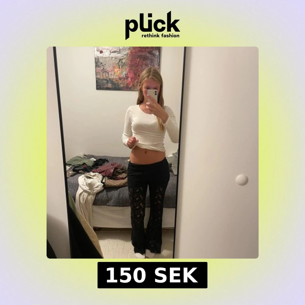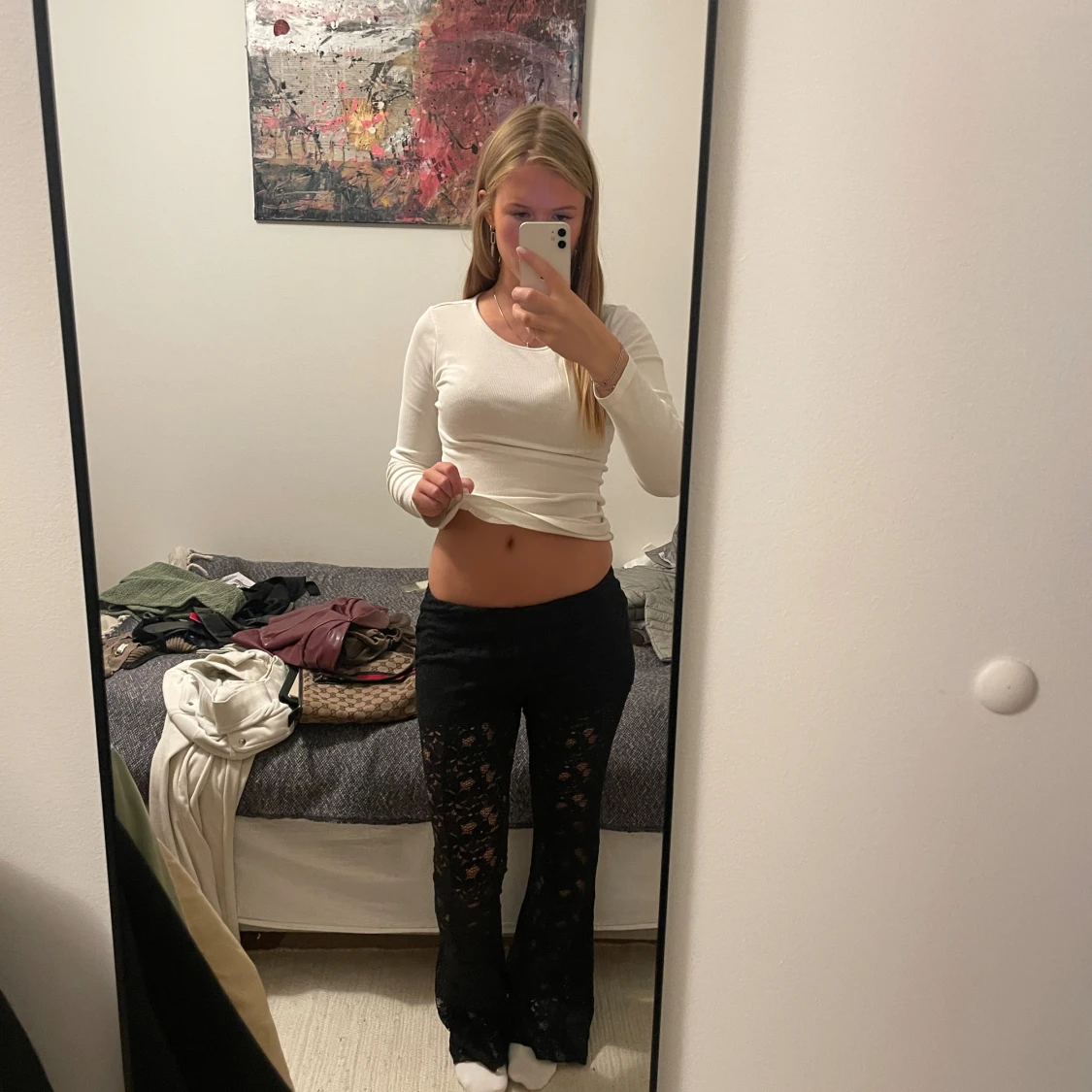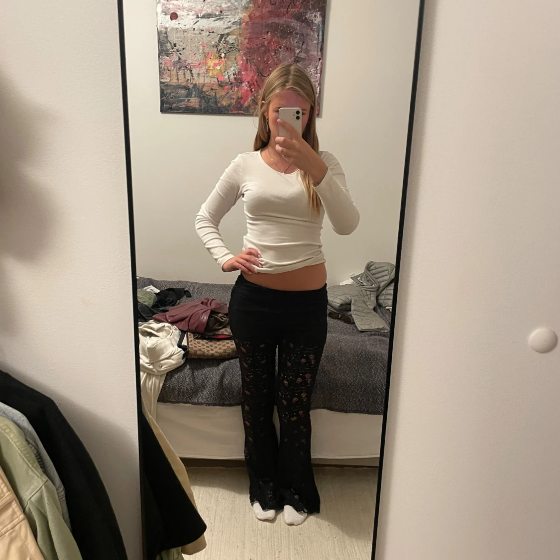 Säljer ett par svarta byxor i genombruten spets med blommigt mönster. Byxorna har låg midja och utsvängda ben för en trendig look. Perfekta för dig som vill sticka ut och gillar en edgy stil.