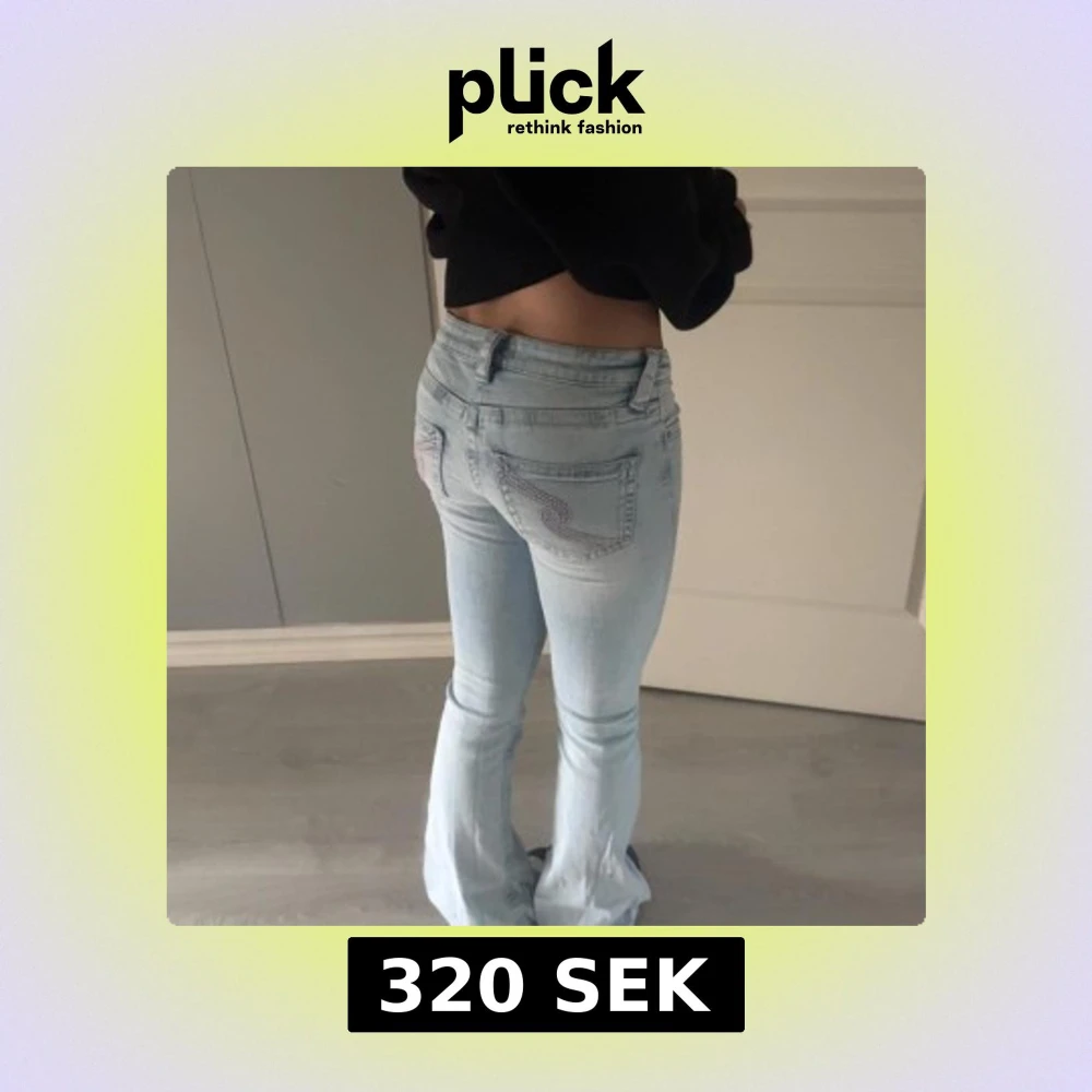 Snygga ljusblå jeans med bootcut-modell och låg midja. Jeansen har broderade detaljer på bakfickorna och klassisk femficksdesign. De är ifrån Gina young 14+. Har knappast använt.