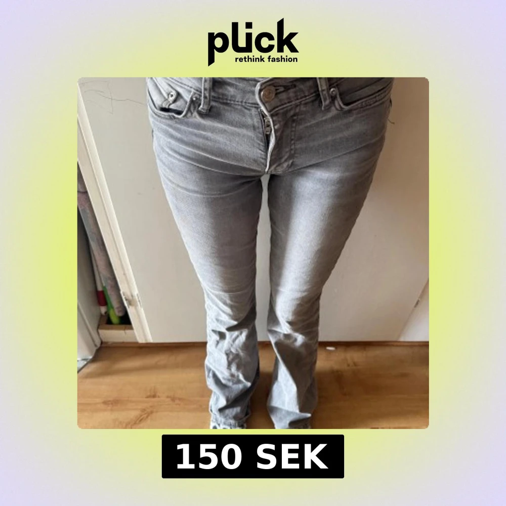 Snygga grå jeansbyxor med låg midja och bootcut-stil. De har en klassisk femficksdesign och stängs med dragkedja och knapp. Perfekta för en avslappnad look.