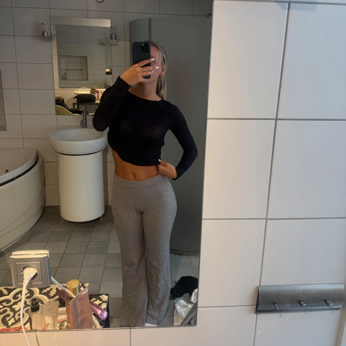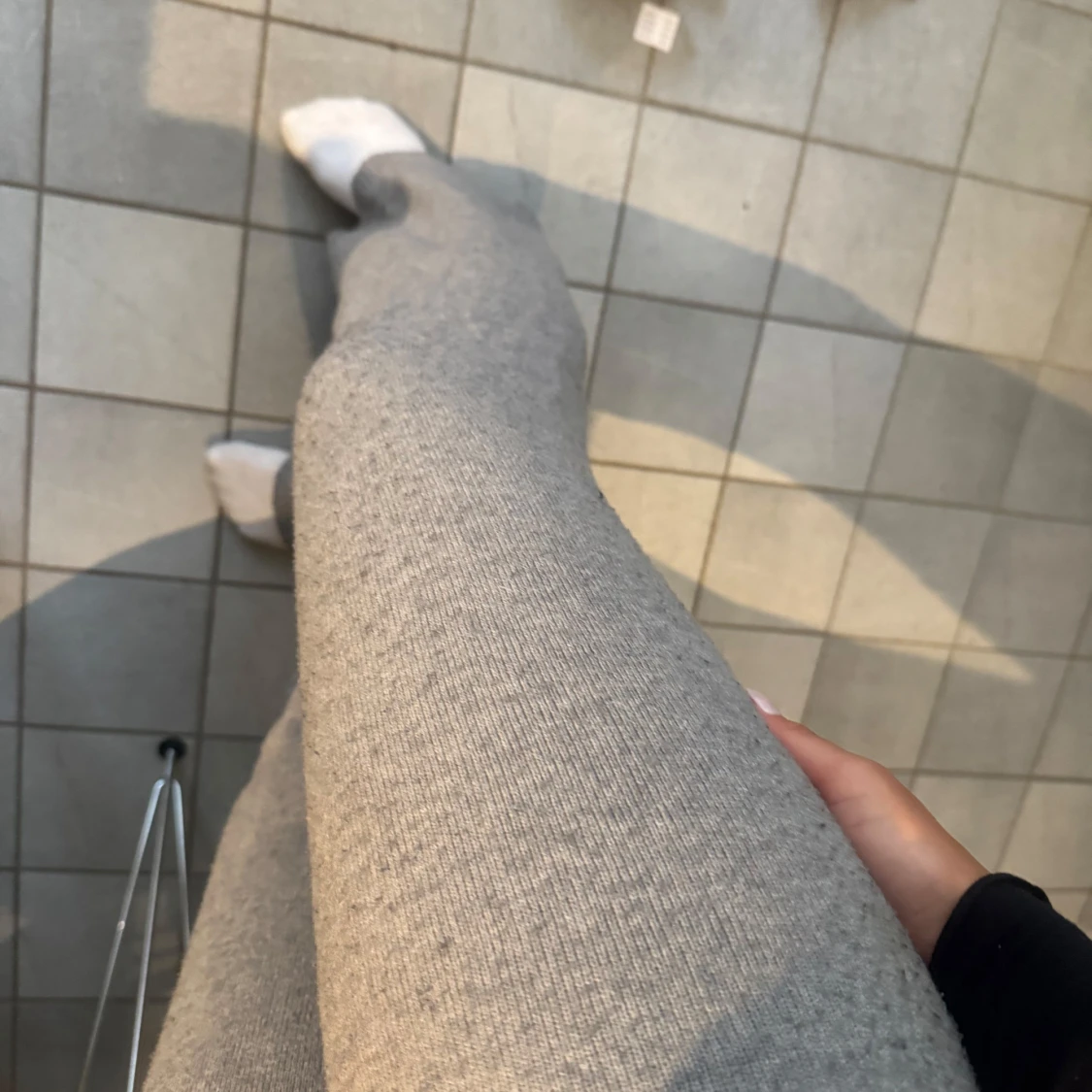 Säljer ett par grå mjukisbyxor med ribbad struktur och normal passform. Byxorna har hög midja och raka ben med lite utsvängd siluett. Materialet är mjukt och stretchigt, perfekt för chill dagar. Färgen är ljusgrå och de är riktigt sköna att ha på sig. Använda ganska mycket så lite noppriga