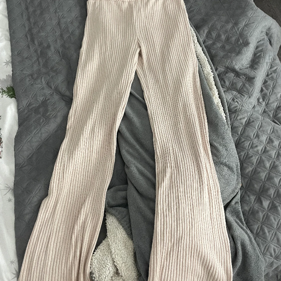 Storlek xxs, bra skick men har dock en liten fläck på fram benet som knappt syns, utsvängda i benen, mjuka o sköna, randigt material, lite genomskinliga. Säljs för dom inte används.