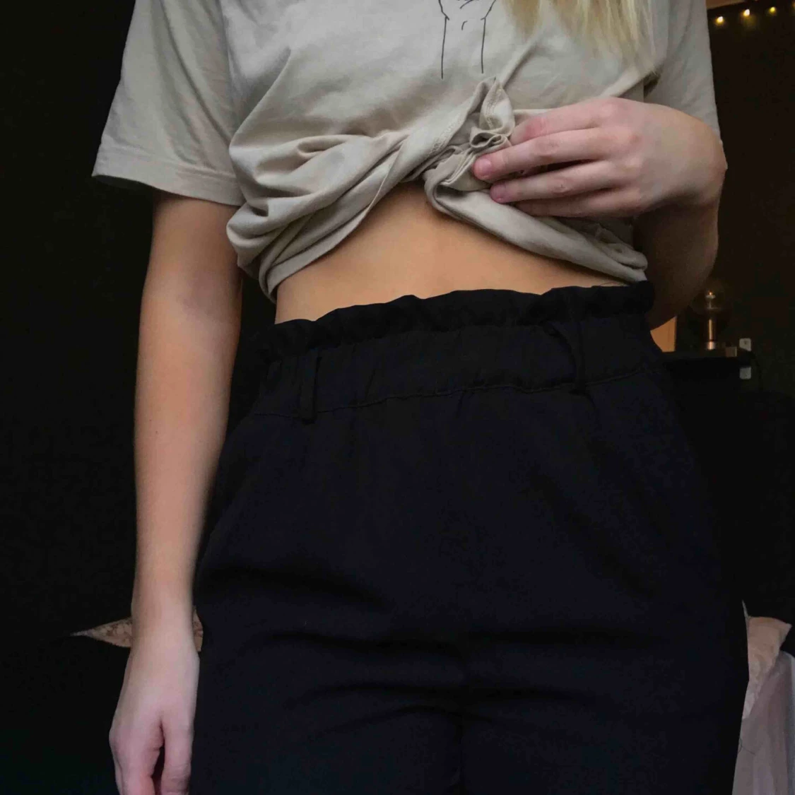 Svarta kostymbyxor med relativt vida ben. Jag är ca 176cm lång och byxorna hamnar på mig perfekt på skorna. Byxorna är så himla snygga men tyvärr glömmer jag bort att använda!!🖤 Köpare står för eventuell frakt.