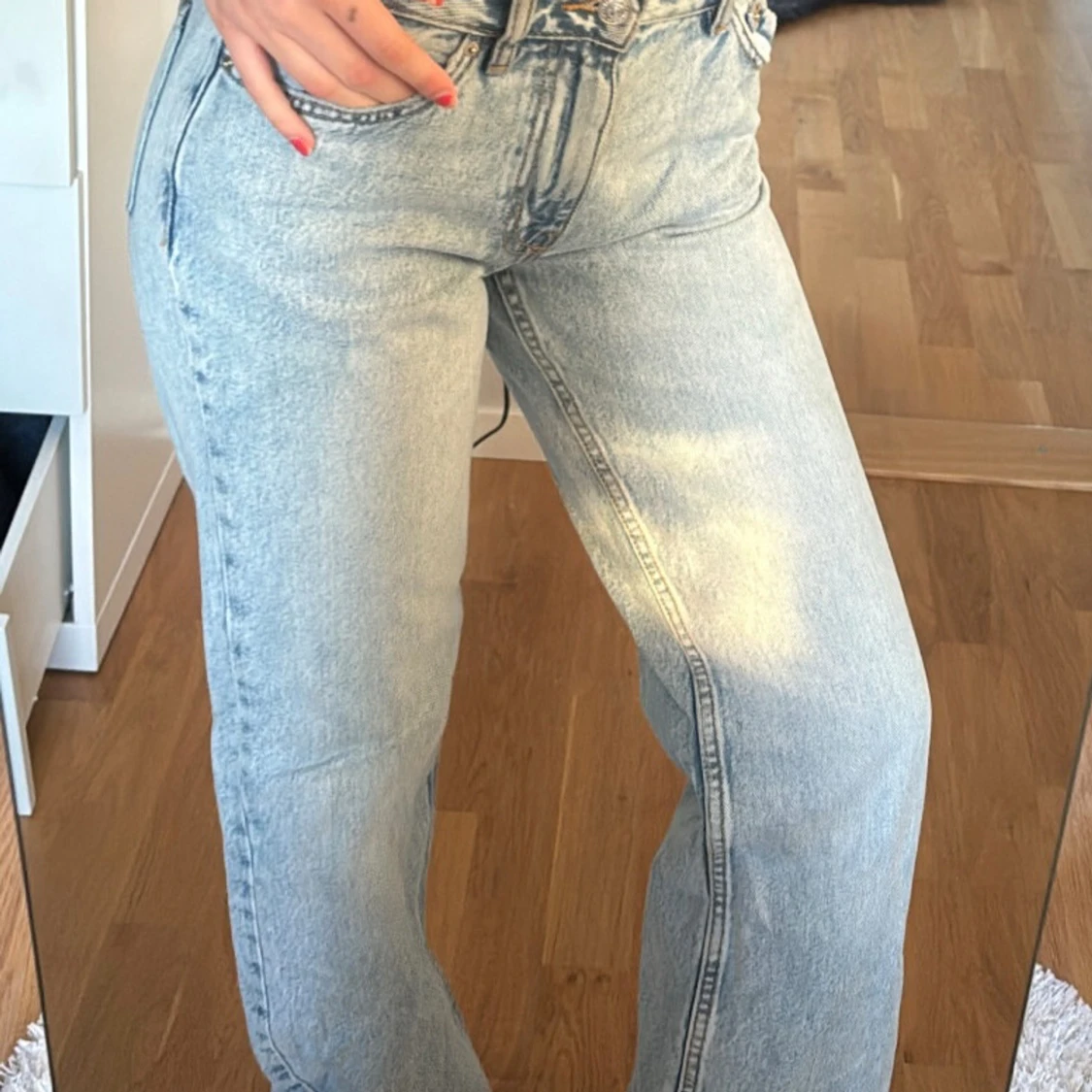 Säljer ett par ljusblå raka jeans från Gina triocit med klassisk femficksdesign och medelhög midja Jeansen har en avslappnad passform och är perfekta för en chill och stilren look. Snygg tvätt!! Hör av er vid frågor
