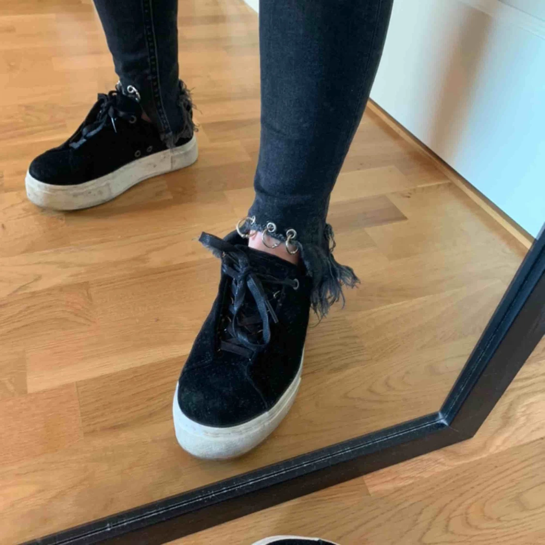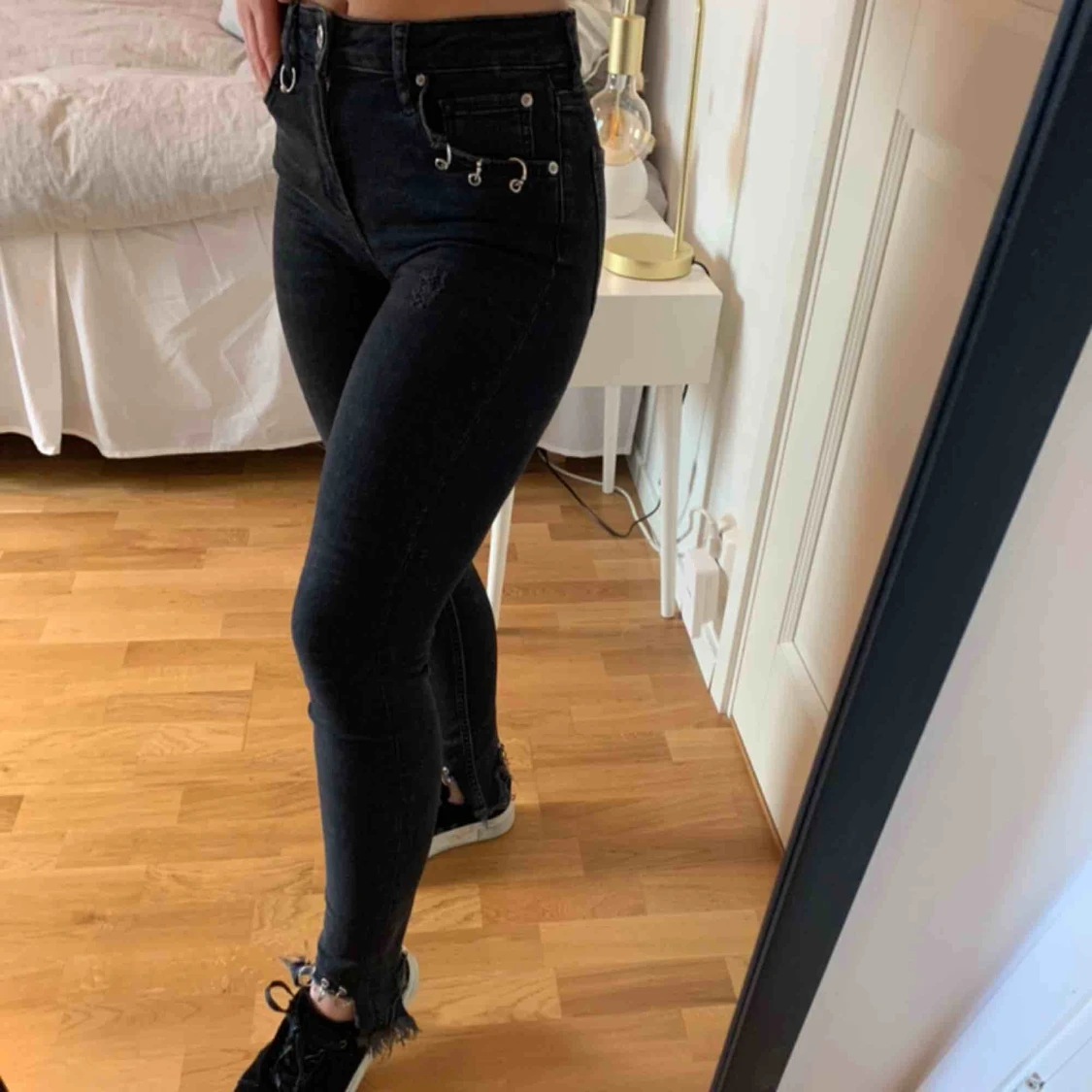 Svarta/mörkgråa jeans i en tightare passform ursprungligen från Gina Tricot. Silverdetaljer i form av ringar både vid framfickor och vid fotändan, även slitningar vid fotändan. Superbra skick.