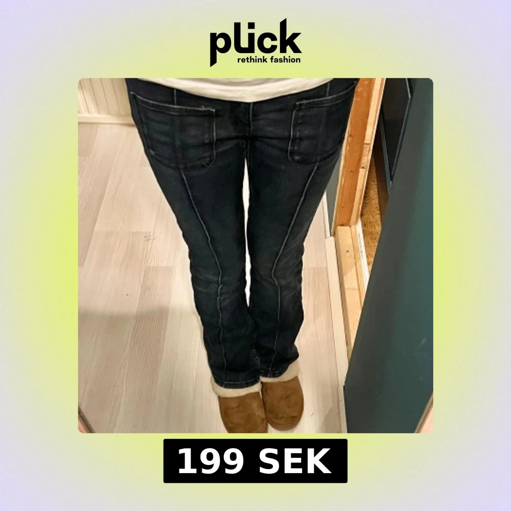 Snygga blå jeans från Gina Tricot med bootcut passform, stora framfickor, markerade sömmar längs benen och dubbla knappar. Storlek 158, midjemått 38 cm och innerbenslängd 75 cm.