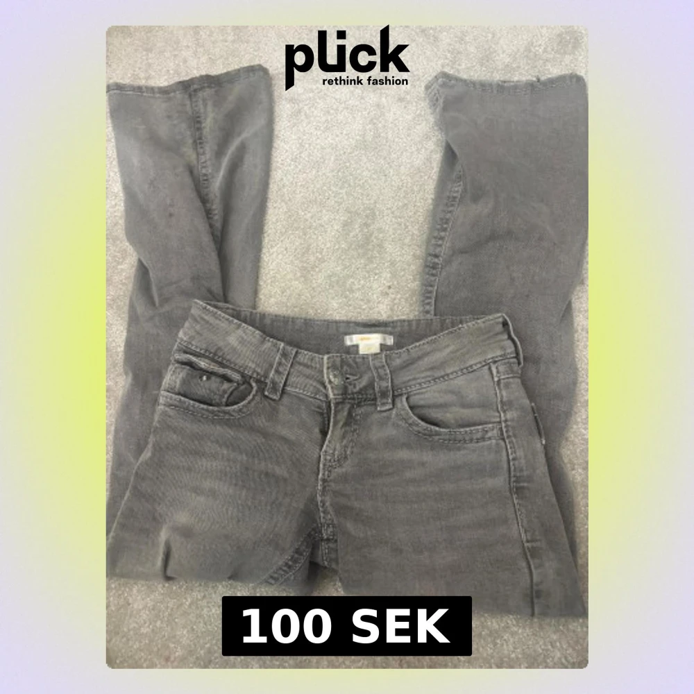 Ett par gråa bootcut jeans från GinaTricot i storlek 146 med detaljerade fickor samt en liten ficka där fram på byxorna, dem är lite svarta ner på benet men inget som märks av riktigt.