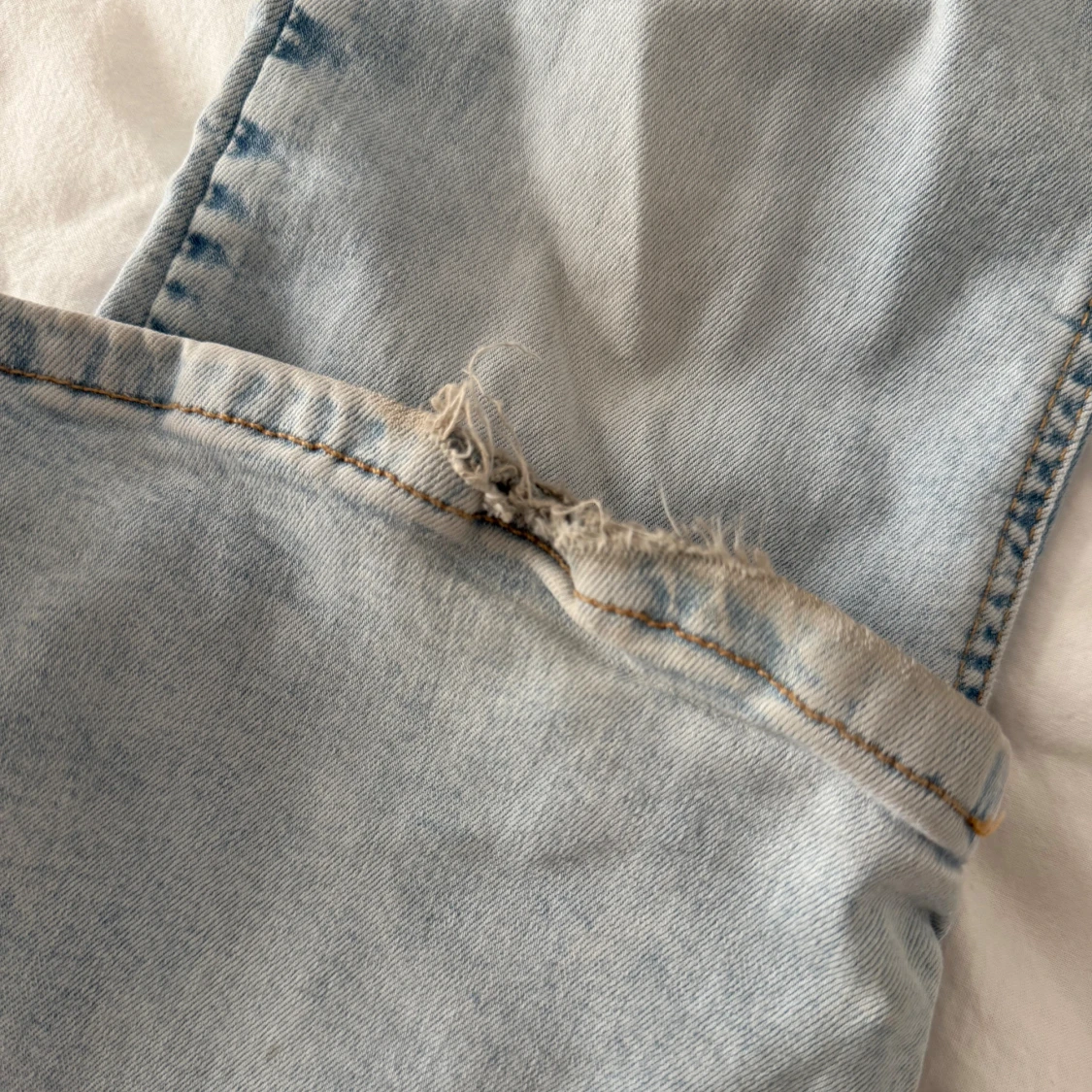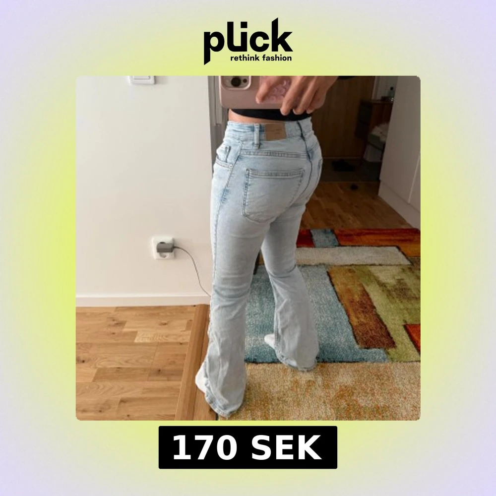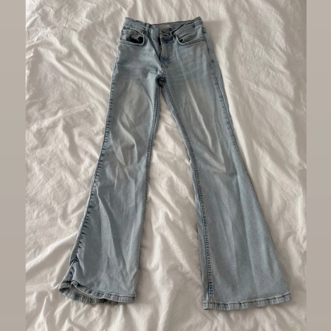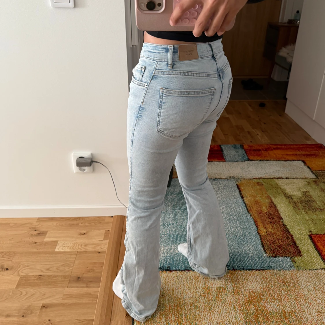 Säljer ett par ljusblå jeans med bootcut-modell. Jeansen har klassisk femficksdesign, dragkedja och knapp framtill. Tillverkade i jeansmaterial och har en snygg, utsvängd passform nertill. Det finns slitage där nere på baksidan av jeansen (se sista bild)💞