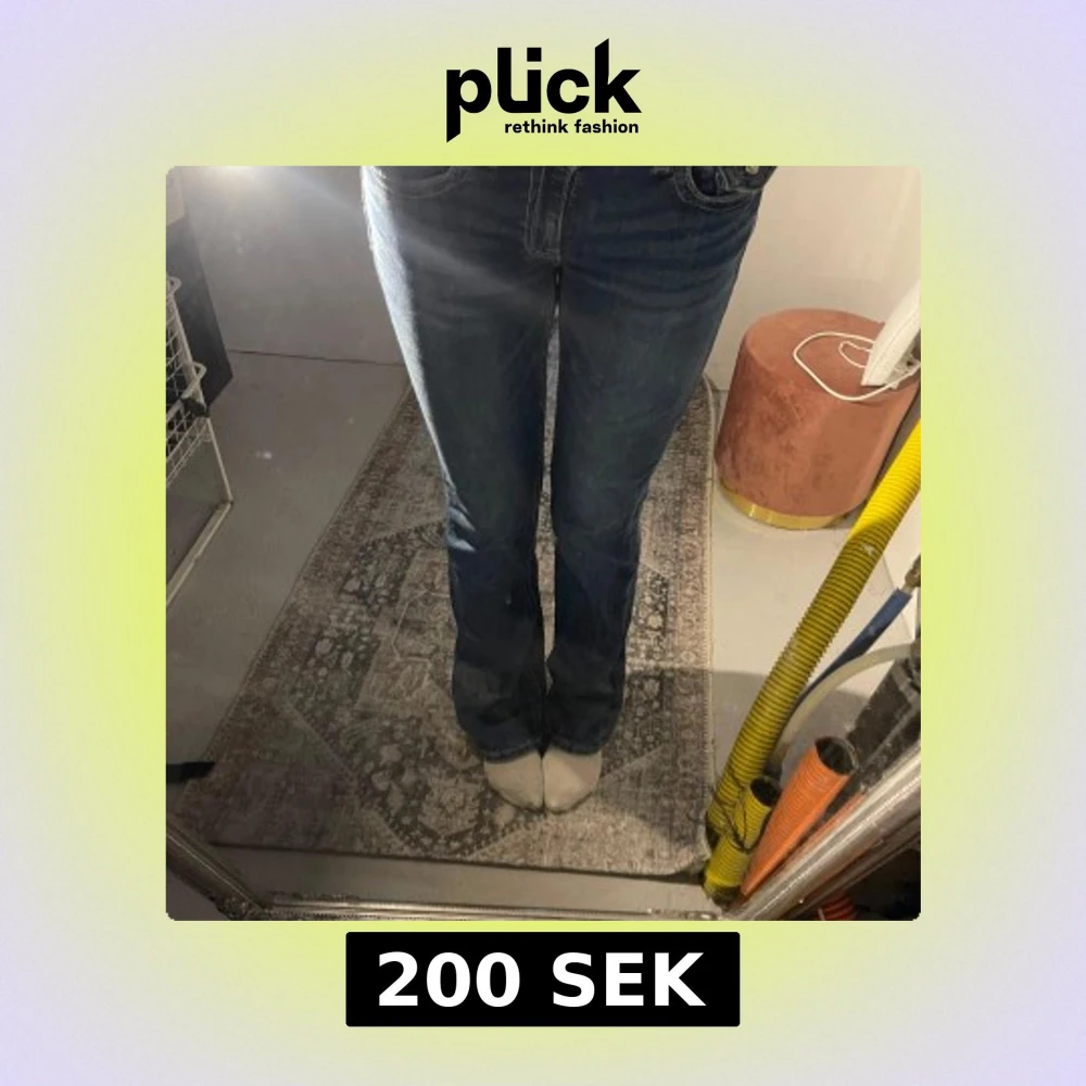 Säljer ett par klassiska blå jeans med bootcut-modell och low waist, samt fem fickor och tydliga sömmar. Perfekta för dig som gillar en tidlös och avslappnad stil.