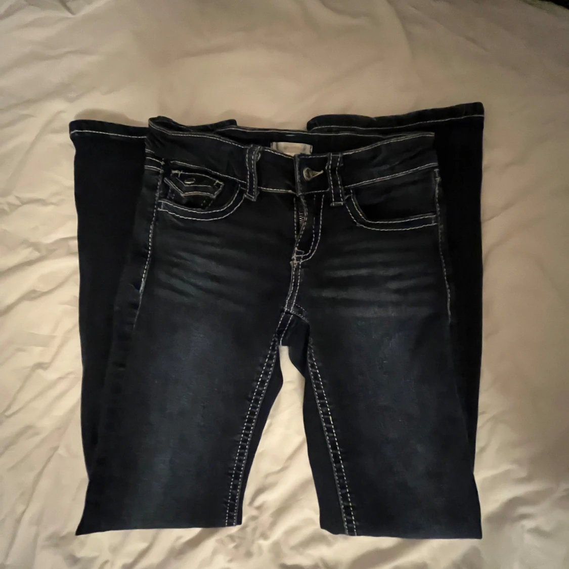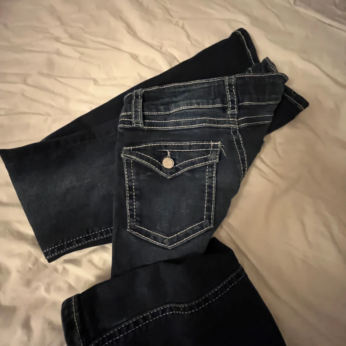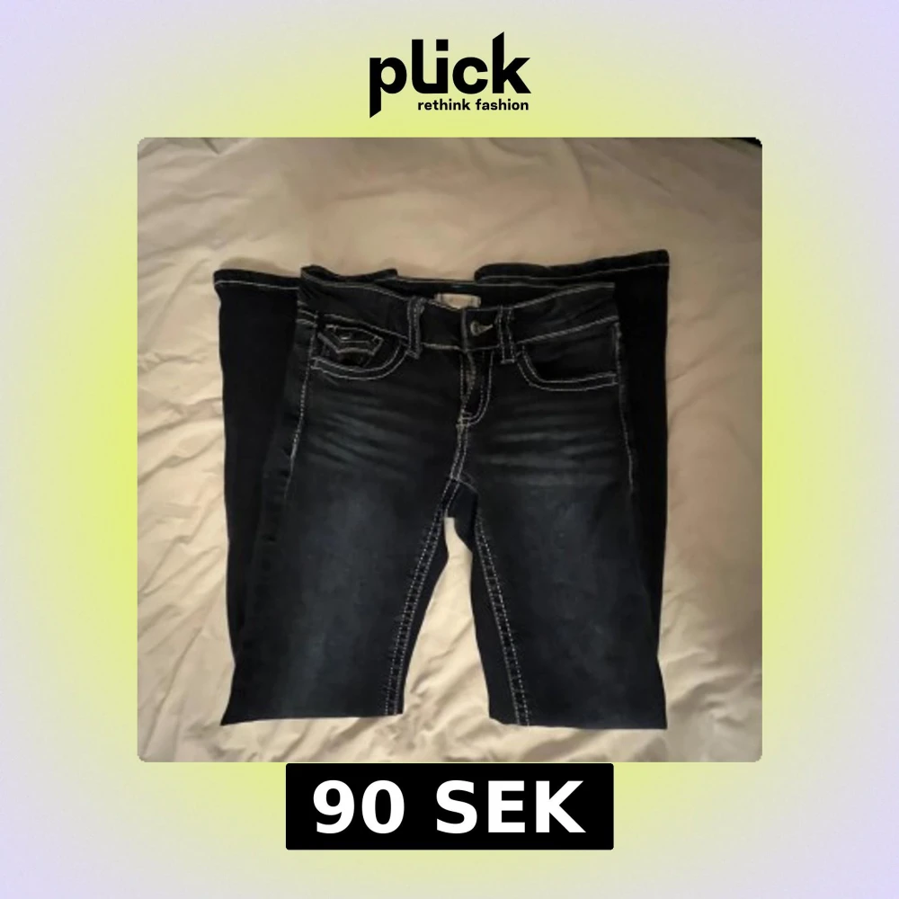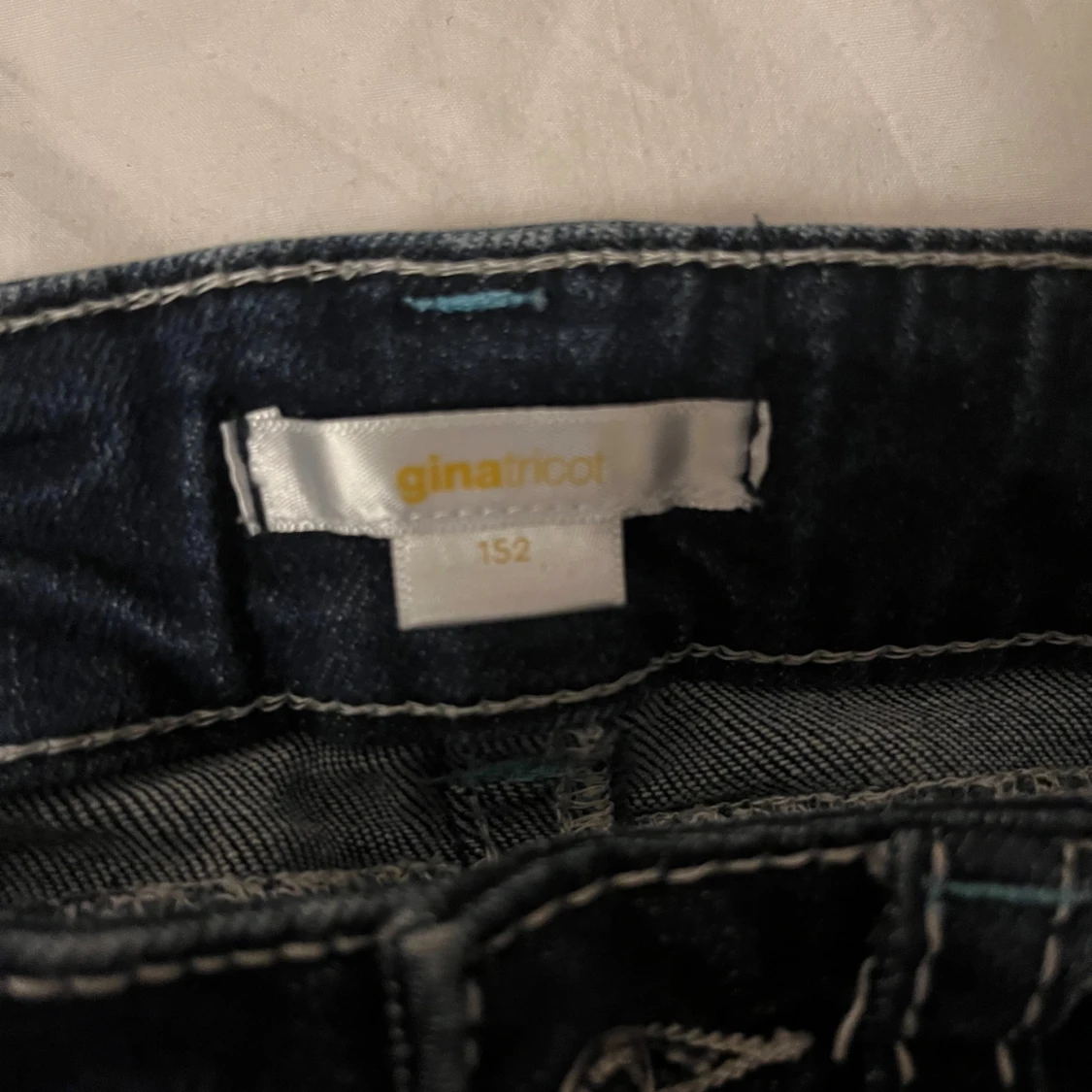 Snygga mörkblå jeans från Gina Tricot med kontrasterande vita sömmar. Klassisk femficksdesign och knappgylf. Perfekta för en avslappnad stil.