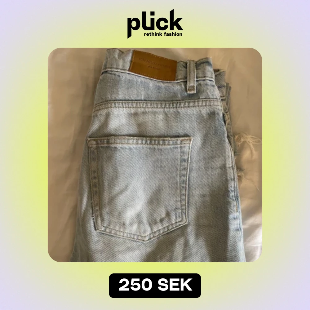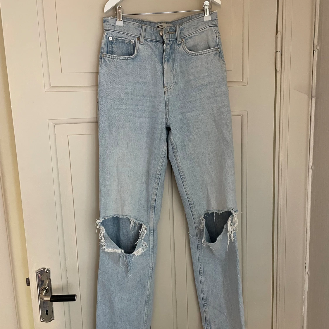 Ljusblå höga jeans med hål på båda knäna. Flitigt använda men i bra skick. Säljes då de är för små.