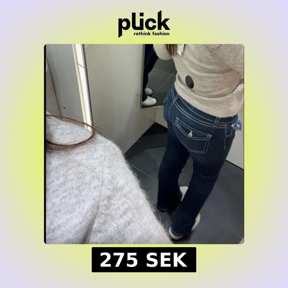 Snygga mörkblå jeans med bootcut passform och markerade vita sömmar. Byxorna har låg midja, klassiska fickor och dragkedja framtill. Perfekta för en trendig och avslappnad look. Köpt på Gina Young i storlek 170 för 360 kr (mycket bra skick, knappt använda)