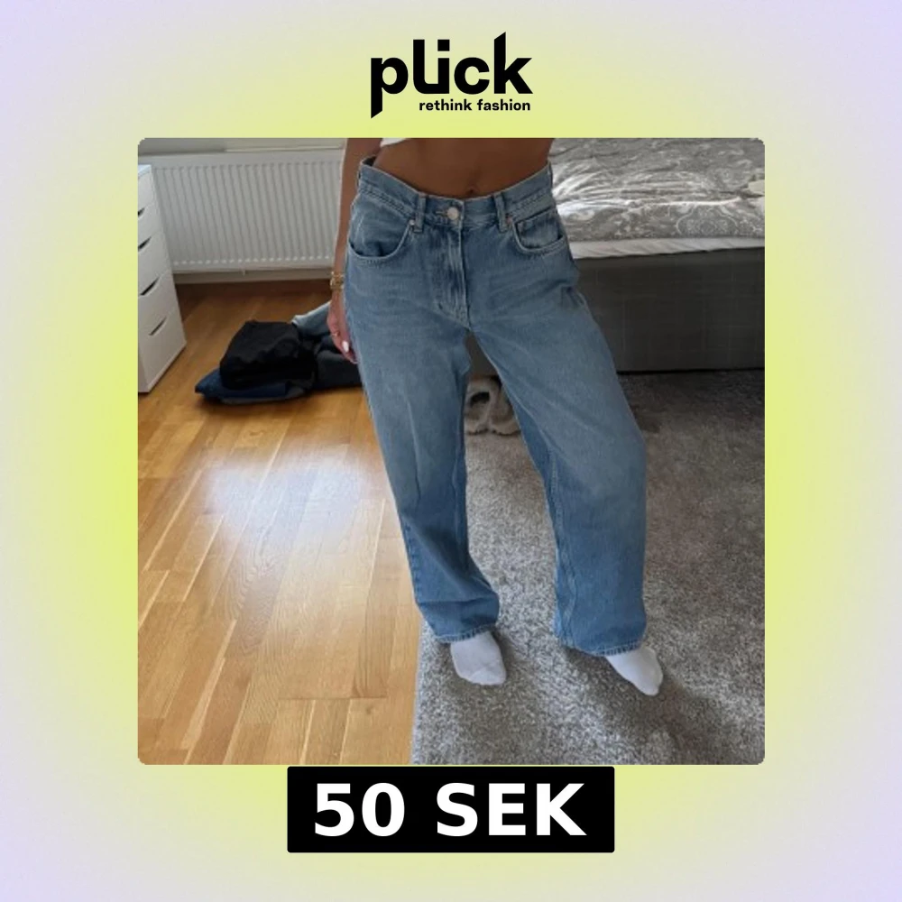 Säljer ett par ljusblå jeans från Gina Tricot i modell med breda ben och klassisk femficksdesign. Jeansen har hög midja och raka, loose fit-ben för en avslappnad vibe. Tillverkade i jeansmaterial med snygg tvättad look.