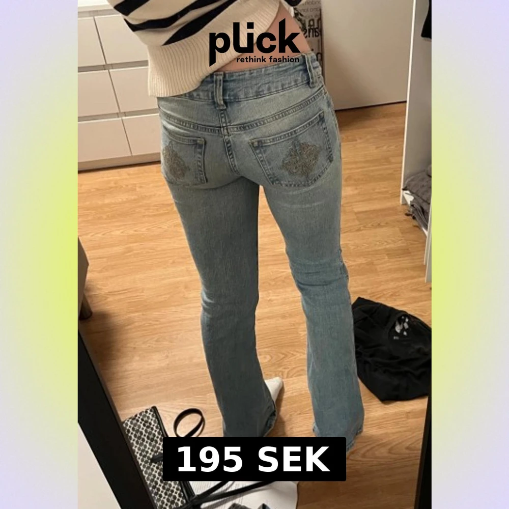Säljer ett par ljusblå jeans med bootcut passform och låg midja. Jeansen har snygga broderade detaljer på bakfickorna och dubbla knappar framtill. Skit snygga o i fint skick 🩵