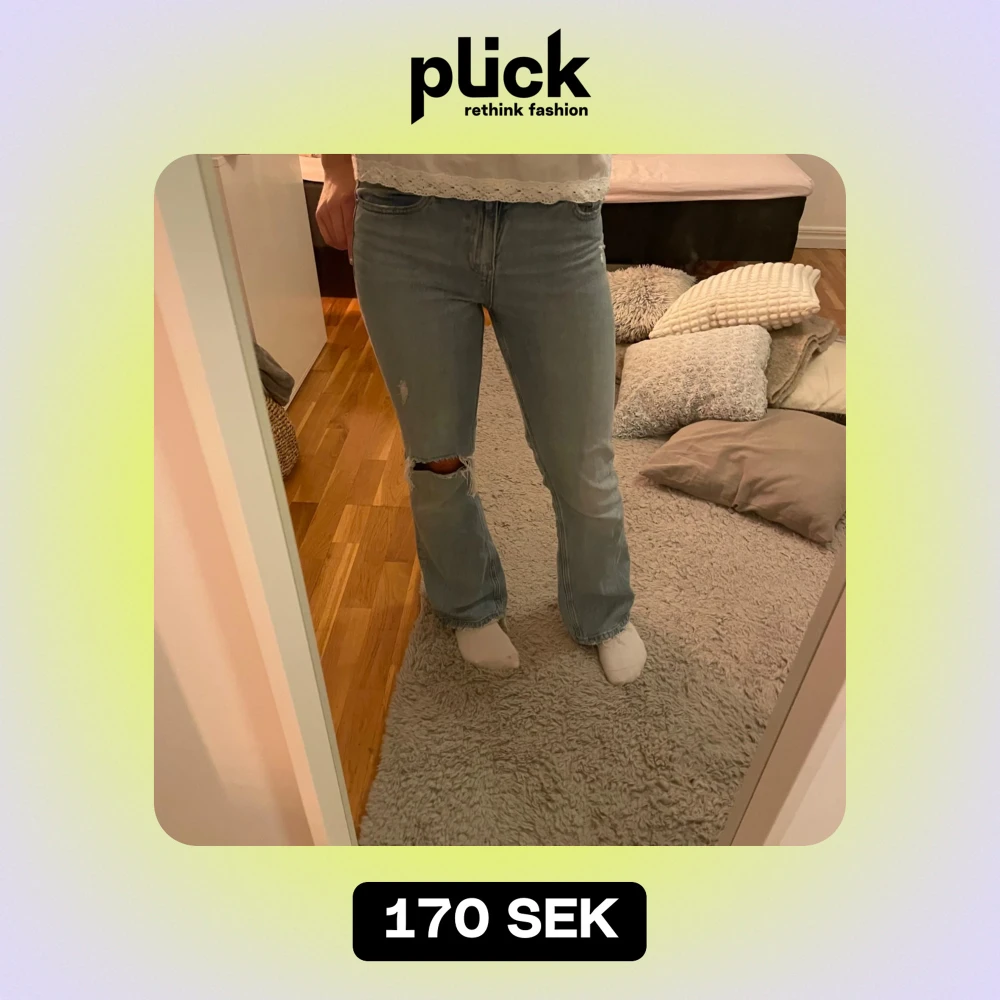 Säljer ett par ljusblå jeans i bra skick. De har en avslappnad passform med slitningar på knäet för en trendig look. Perfekta för vardagsbruk och kan enkelt matchas med olika toppar. Passar bra till både sneakers och boots.