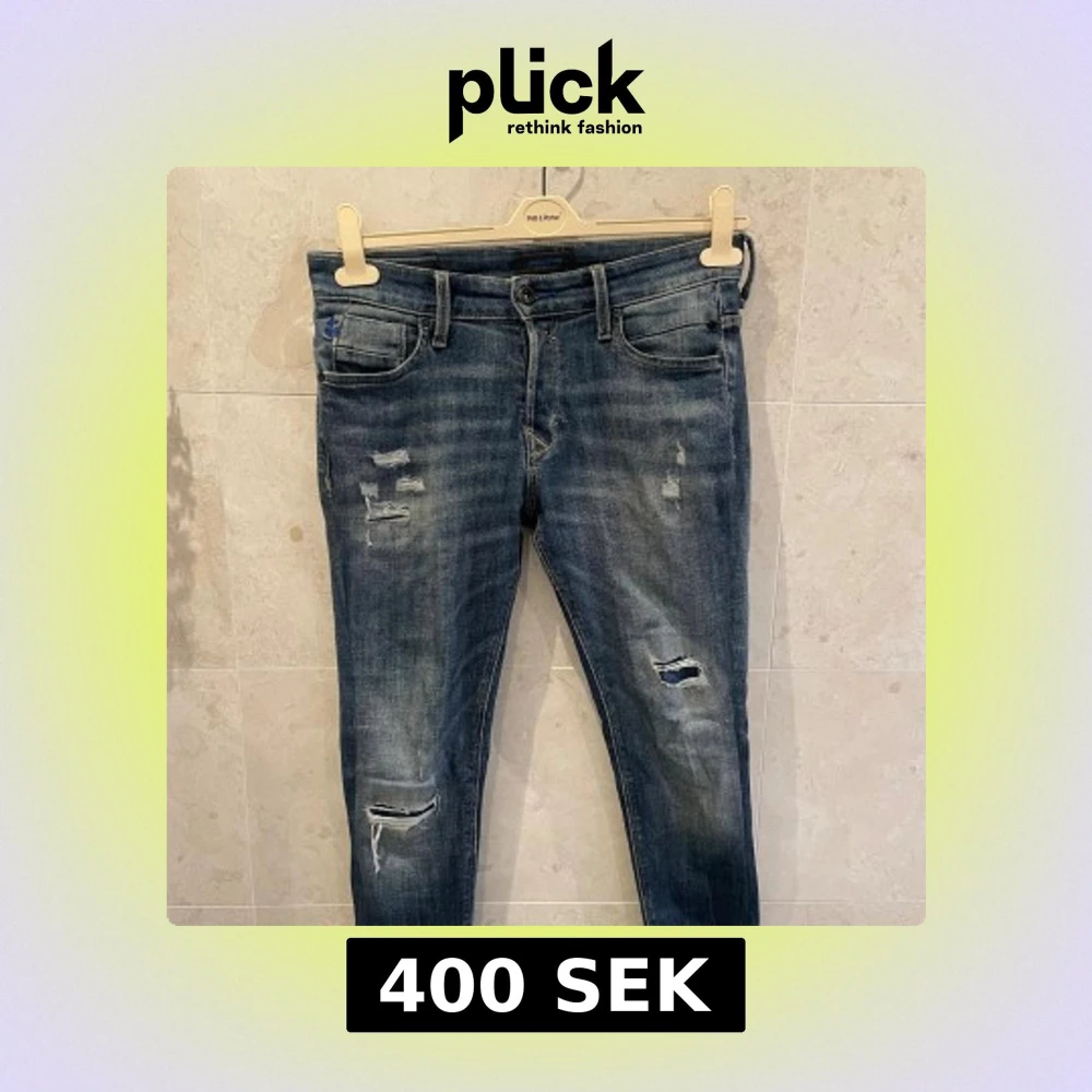 Snygga blå jeans från Jack & Jones i storlek 29/32 med slitningar och trasiga detaljer på benen. Modellen har klassisk femficksdesign, gul kontrastsöm på bakfickorna och en smal passform som sitter riktigt bra. Perfekt för dig som gillar en cool och avslappnad stil.