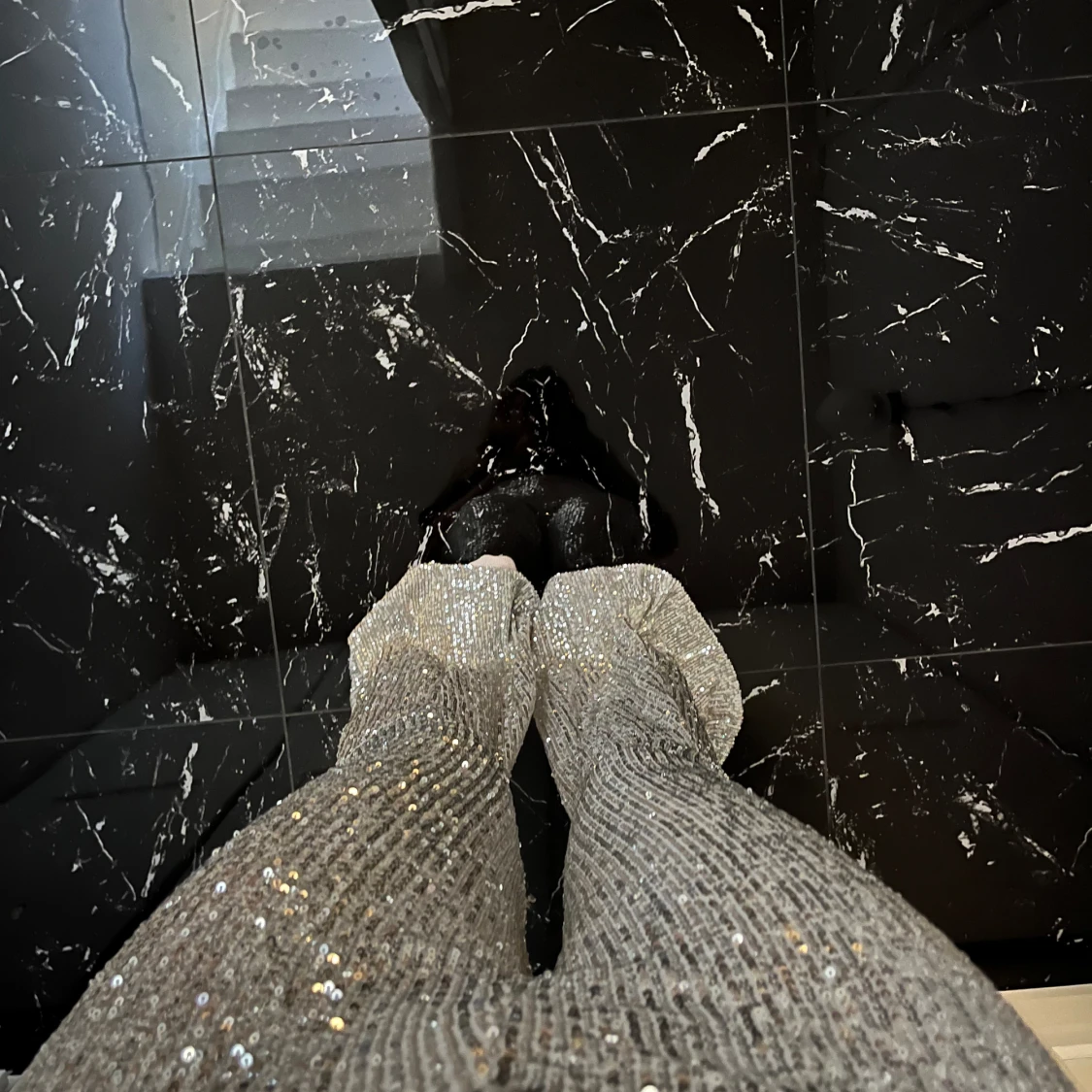 Glitter byxor med utsvänga ben i silver. Helt oanvända! Långa i benen!