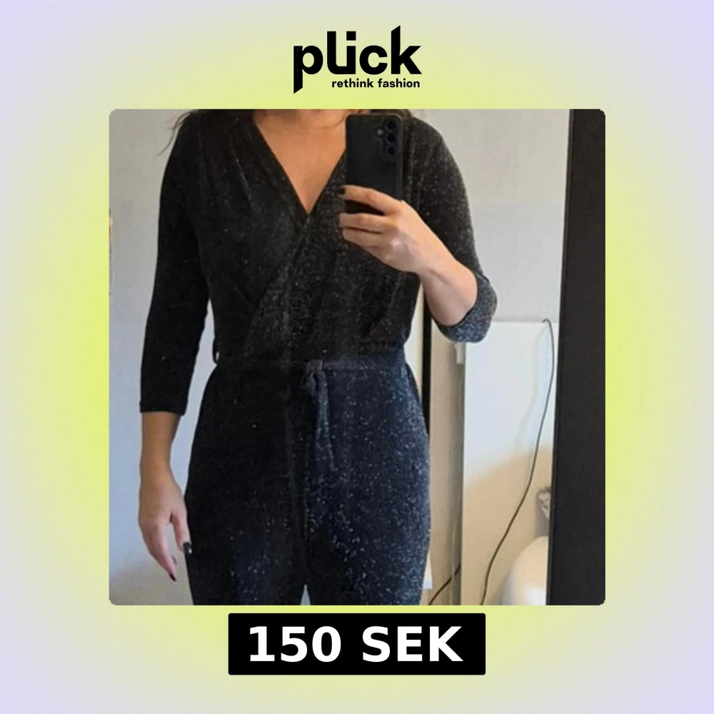 Elegant svart glittrig v-ringad jumpsuit / byxdress. * Stl M. - Total längd 138 cm (jag är en 165 cm) - Innerbensmått 60 cm. * Omlottdesign med V-ringning och 3/4-ärmar. * Tillhörande knytband för midjan. * Väldigt stretchig, bekväm och skön. * Mycket bra skick. Använd vid ett tillfälle. * Perfekt för festliga tillfällen! Nyår nalkas ;) Djur och rökfritt hem. Se bilder och förstora då de ingår i beskrivningen. Se gärna mina övriga annonser. Vid avhämtning finns den i Sollentuna.