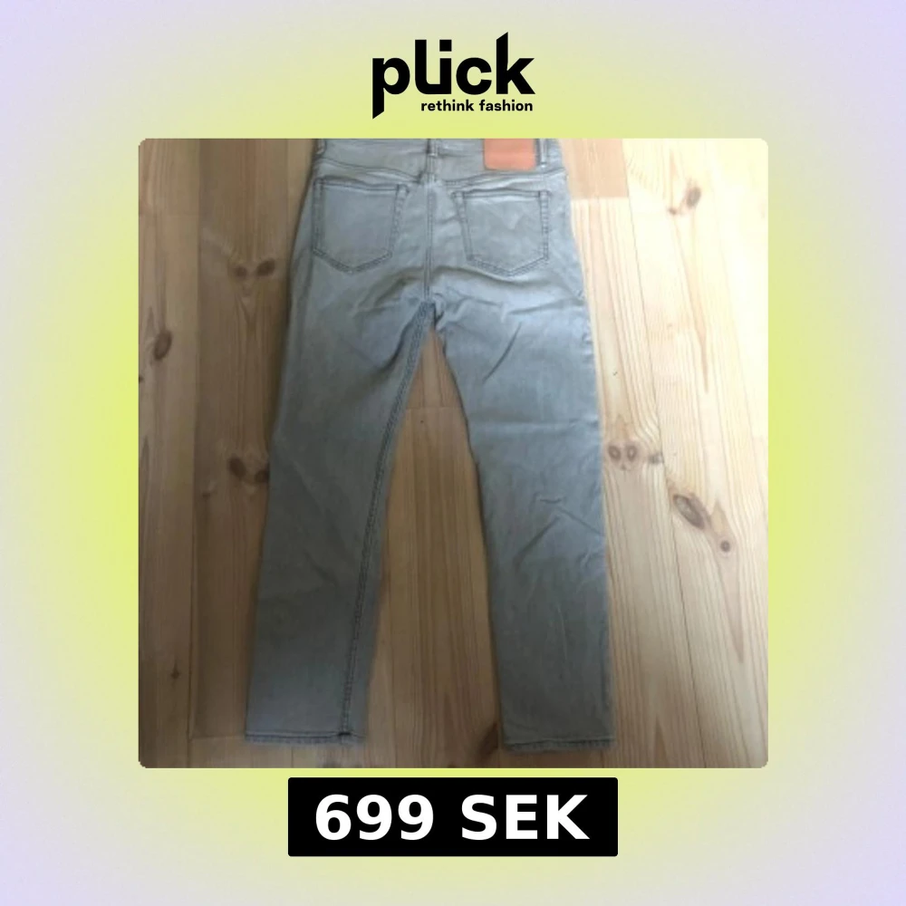 Snygga grå jeansbyxor från Acne Studios med en klassisk femficksdesign. Byxorna har en knappgylf och en läderpatch med logotyp baktill. Perfekta för en stilren look. Nypris 4000