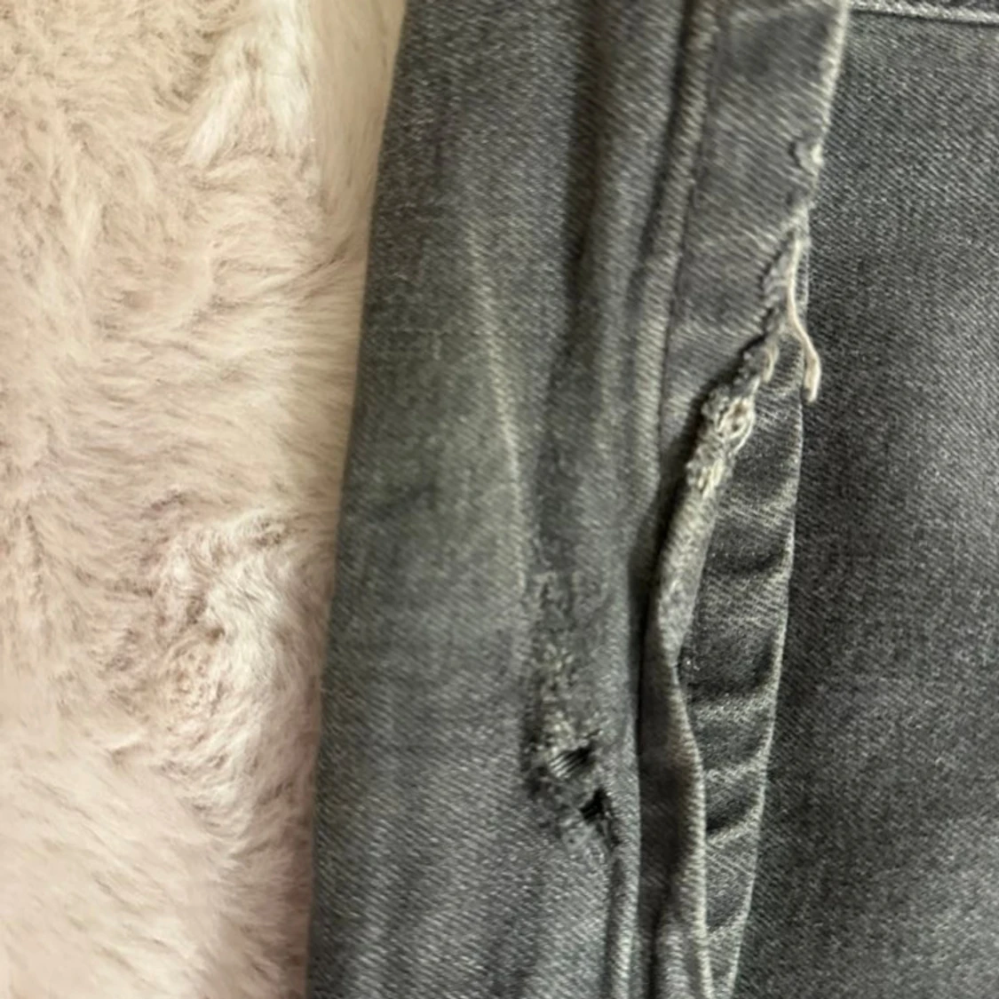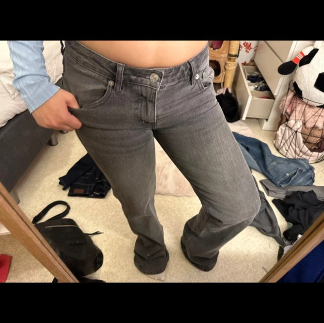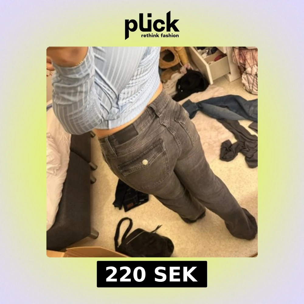 Säljer ett par gråa jeans med bootcut passform och snygga fickdetaljer bak. Jeansen har klassisk femficksdesign, bälteshällor och stängs med knapp och dragkedja. Perfekta för dig som gillar en lite vidare siluett nertill.