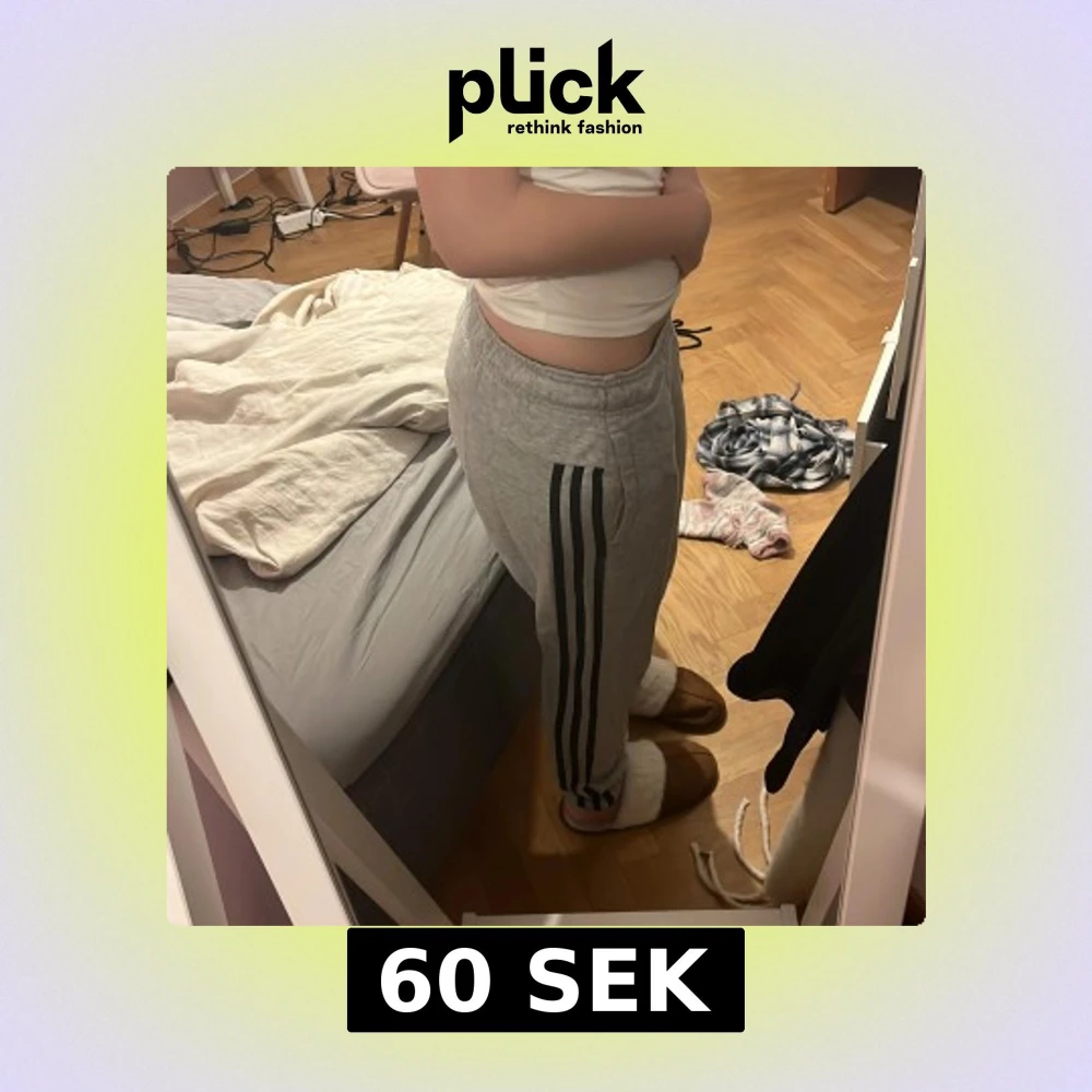 Grå mjukisbyxor från Adidas med klassiska svarta ränder längs sidorna. Byxorna har resår i midjan och är tillverkade i mjukt bomullsmaterial. Perfekta för chill eller träning, med en avslappnad passform och sportig look.