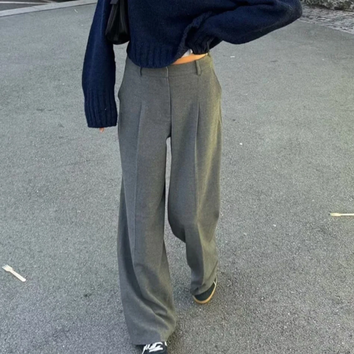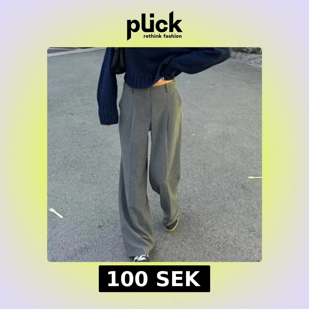 Snygga grå kostymbyxor med hög midja och vida ben. Byxorna har pressveck framtill och klassiska hällor för bälte. Säljes pga att de var lite för stora på mig🩶🩶
