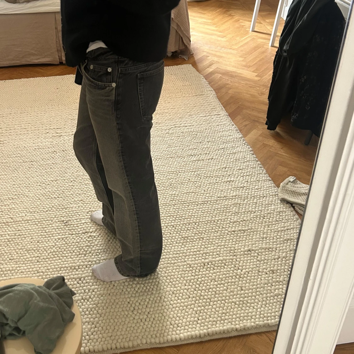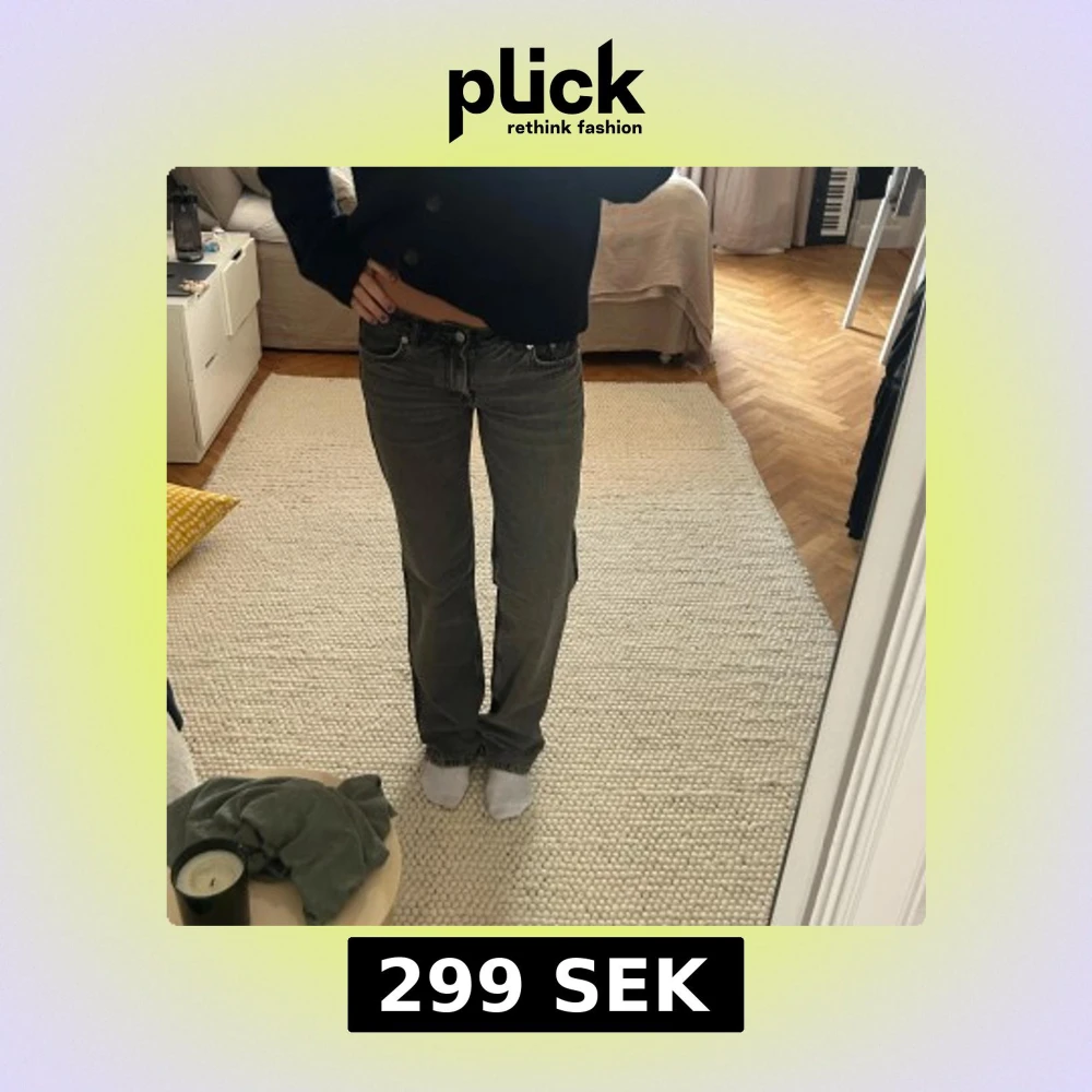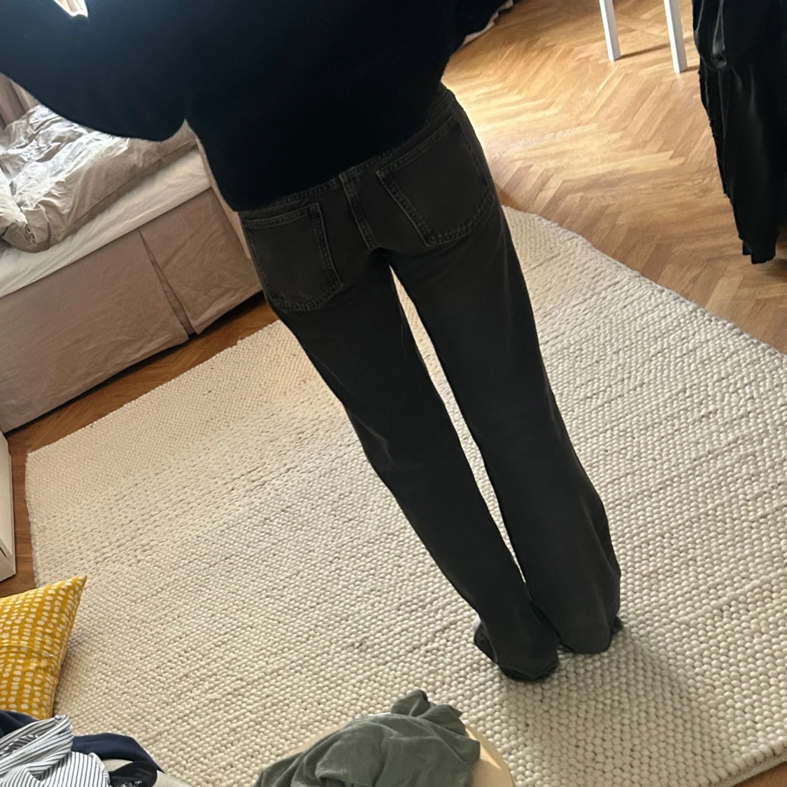 Säljer ett par grå bootcut jeans med klassisk femficksdesign och normal passform. Jeansen har låg midja och raka ben med lätt utsvängning nertill. Perfekta för en avslappnad och trendig look.