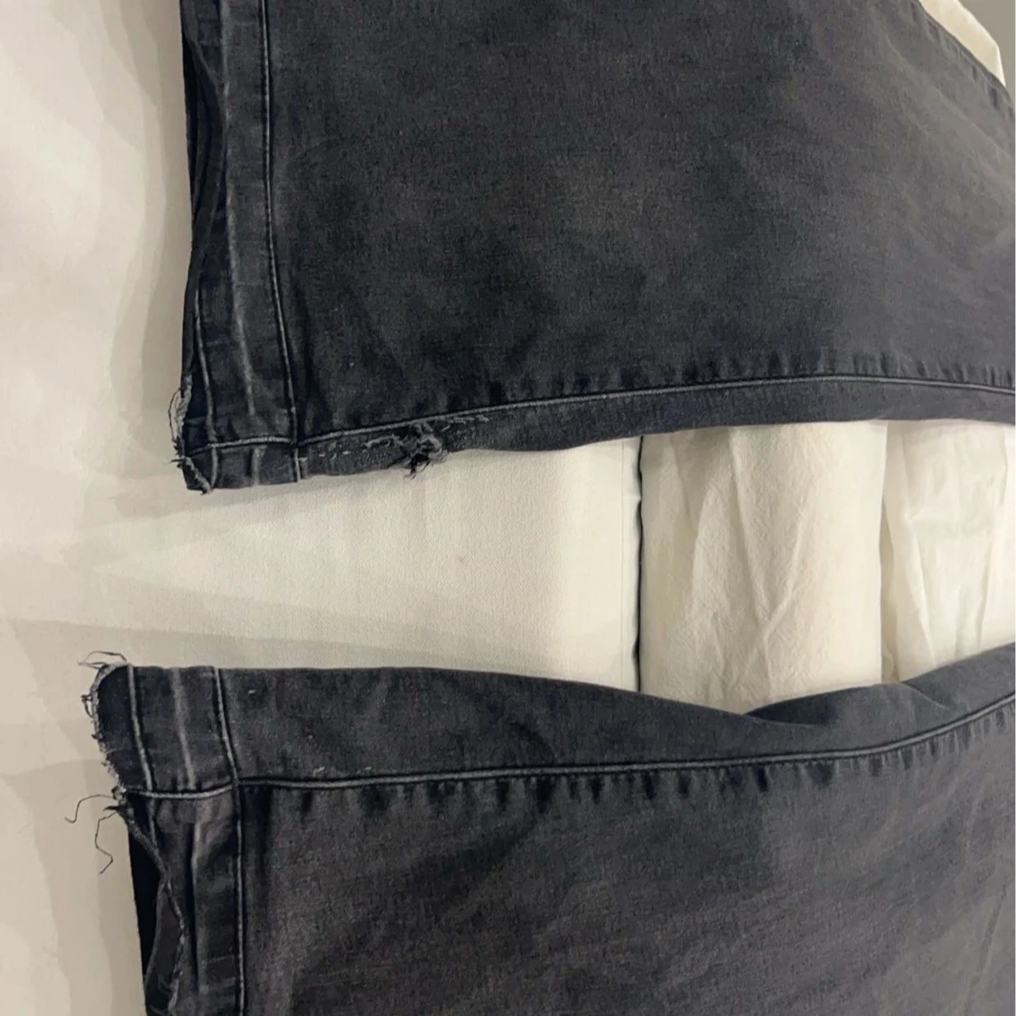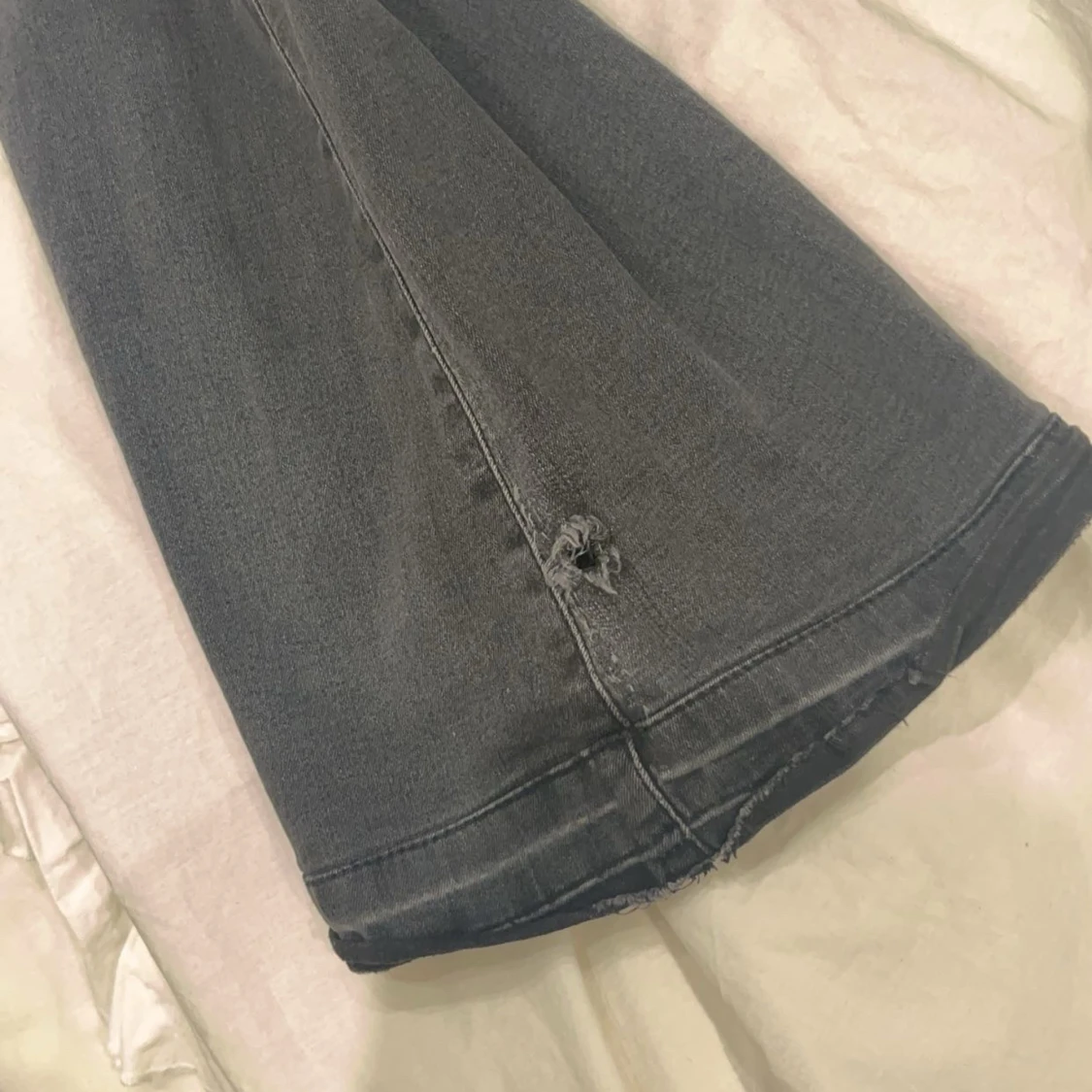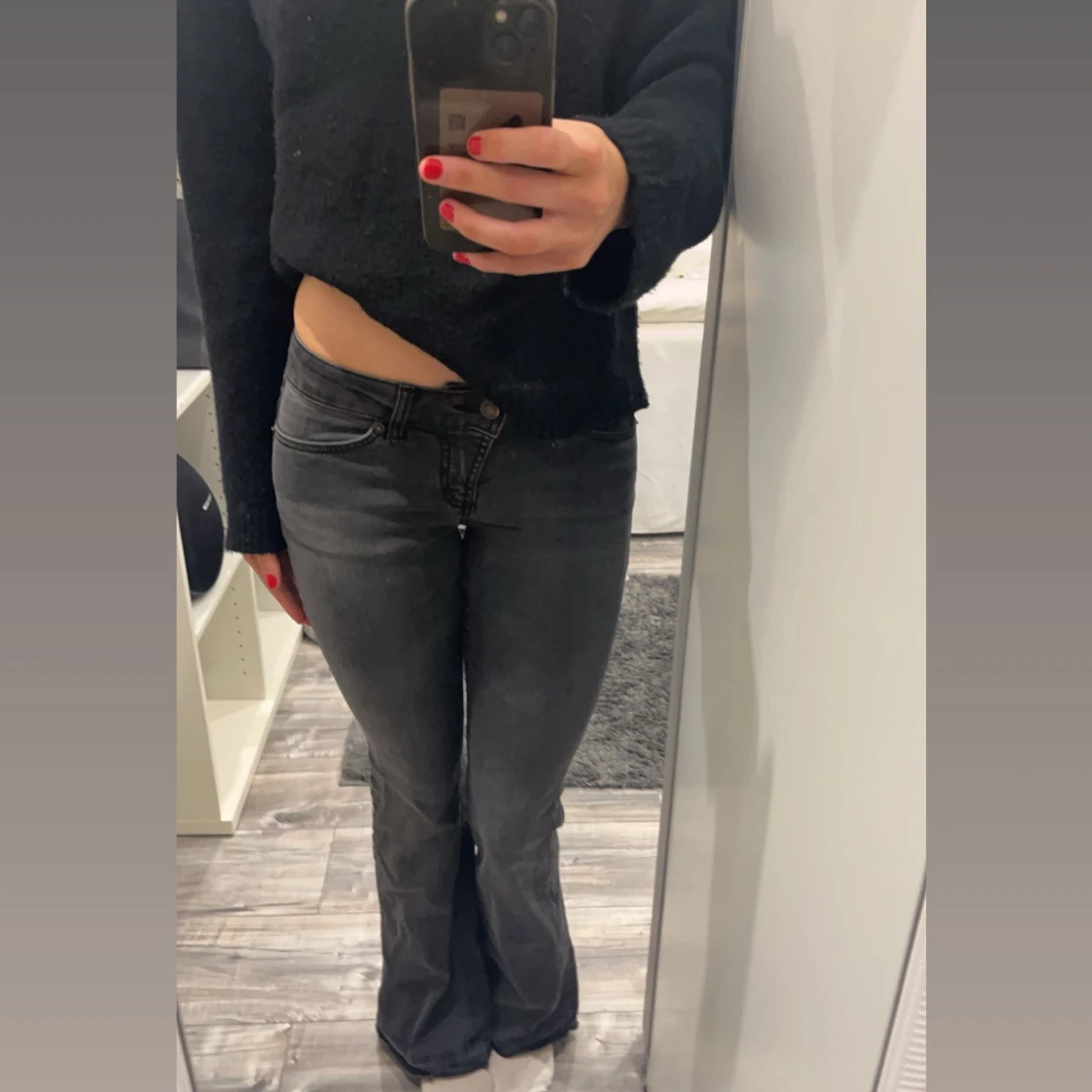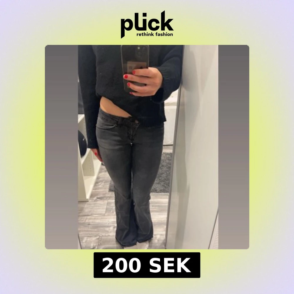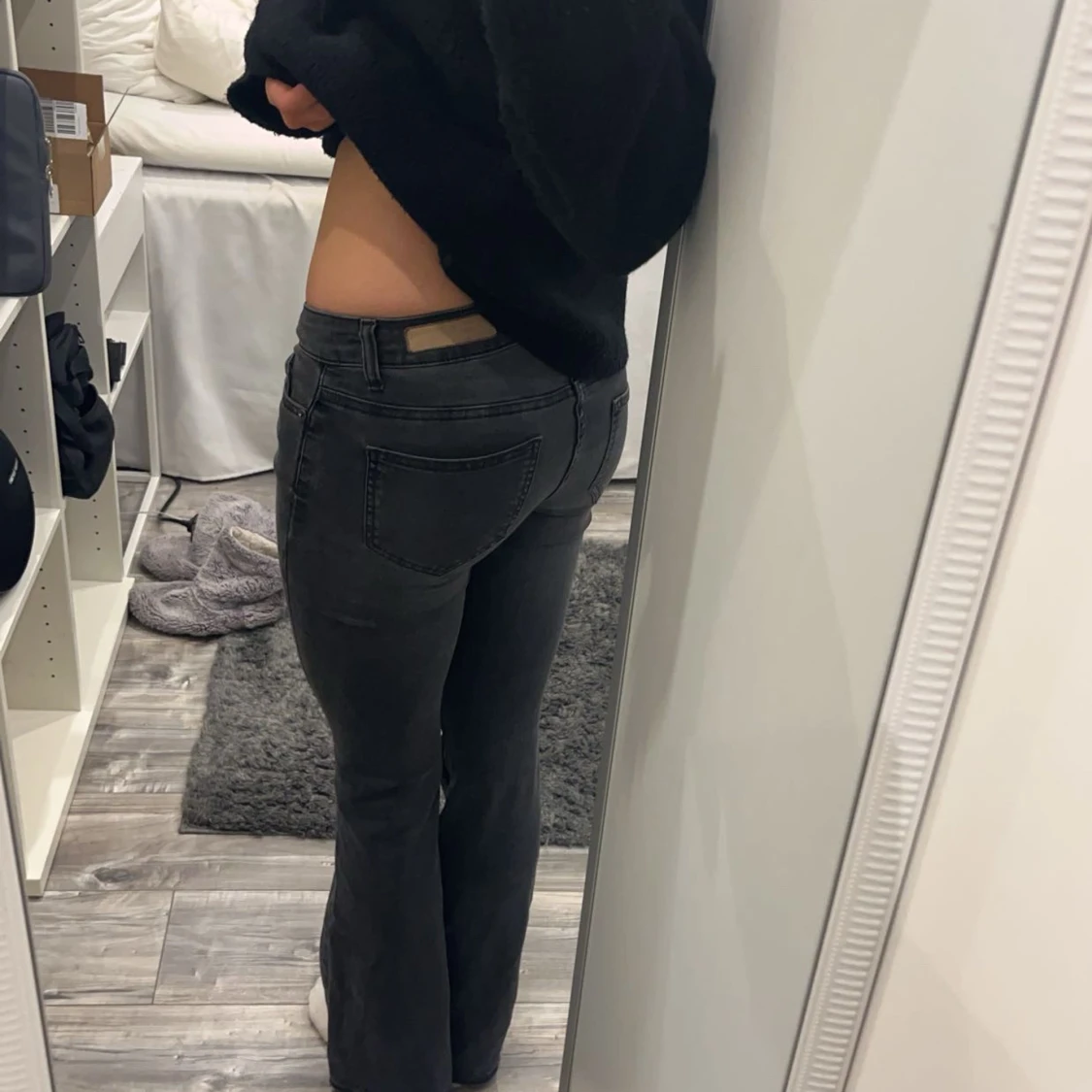Snygga grå bootcut jeans med låg midja. Skulle sagt att de passar 34/36, jag bär 36 och är 177 cm men dessa sitter lite tight på mig. Har ett litet hål på insidan av höger ben (se bild 5) samt uppspeättad sömn där nere.