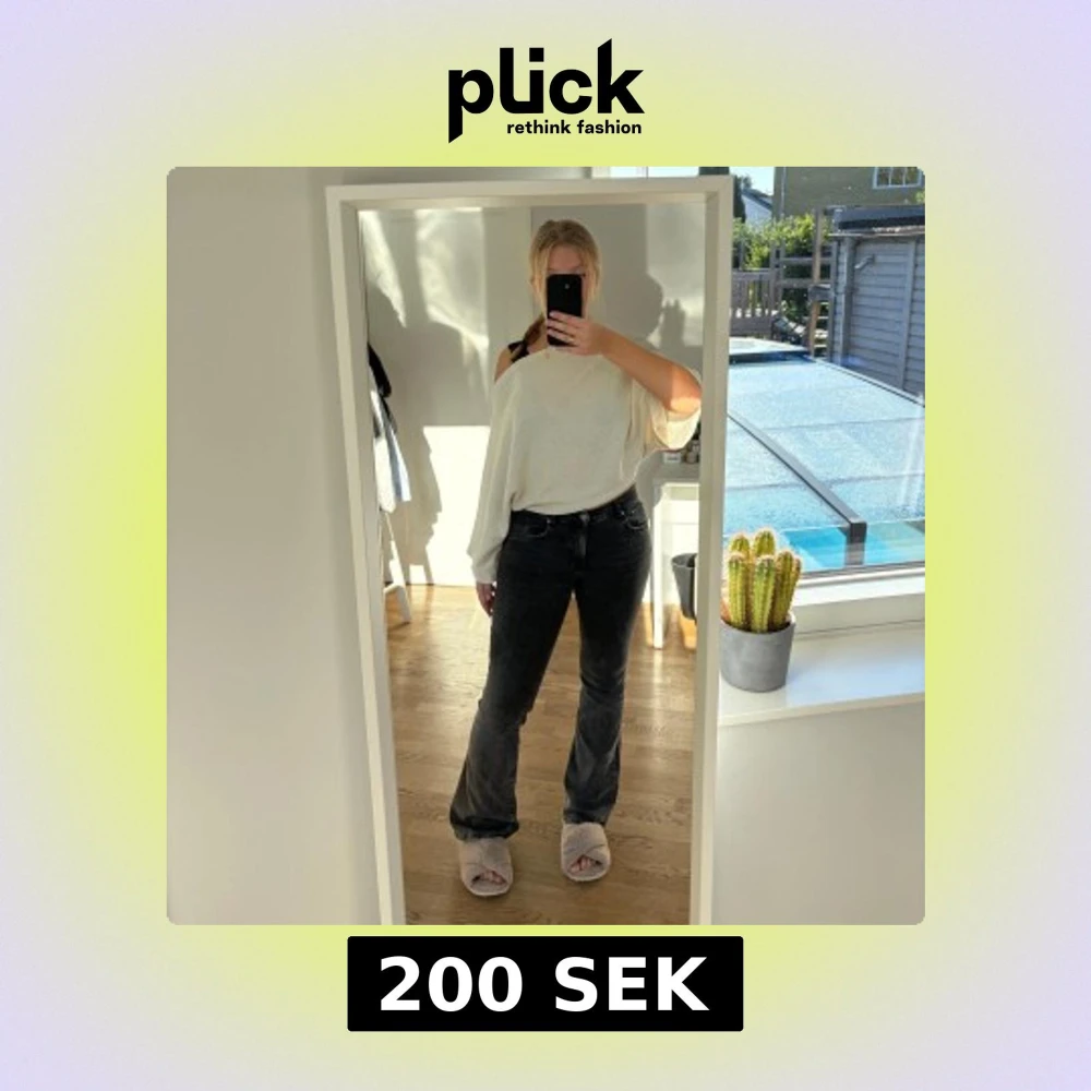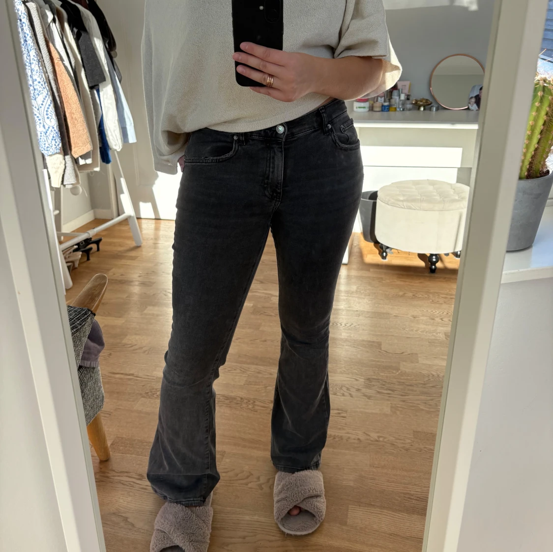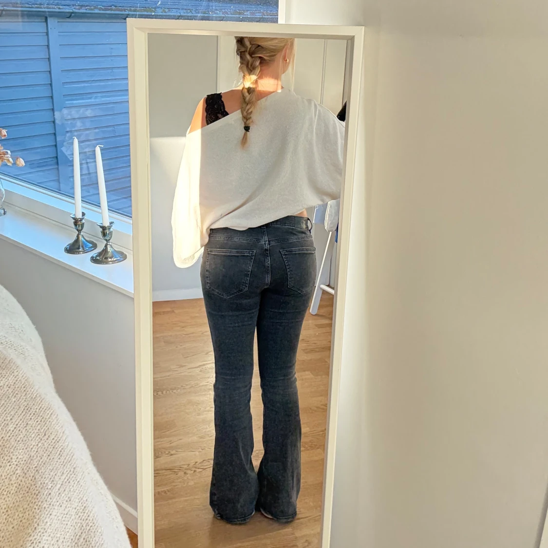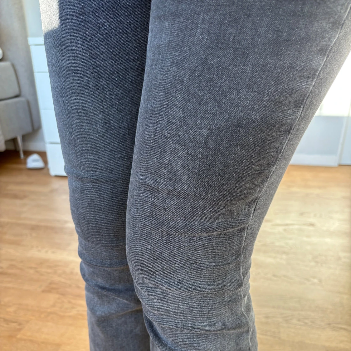 Grå bootcut jeans från Gina tricot i storlek 36. Har en fläck vid sidan av ena låret, eftersom jeansen är lite gråmelerade är det inget som stör jättemycket.