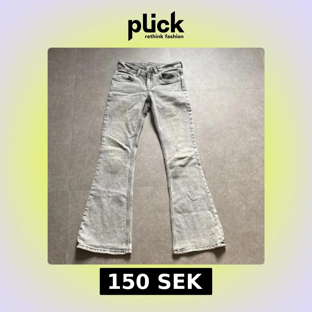Snygga grå jeans från 157 i bootcut-modell med klassisk femficksdesign. Jeansen har en ljusgrå tvätt och raka ben som blir bredare nedtill. Materialet är jeans och lågmidjade. Använda ca 3 gånger.💕