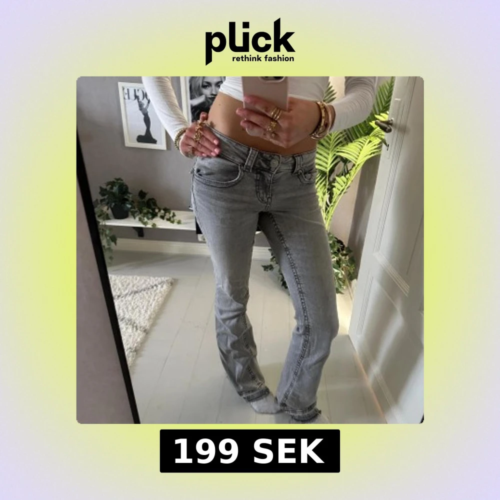 Säljer ett par grå jeans från Perfect Jeans i storlek 36. Modellen har bootcut-ben, låg midja och klassiska fem fickor med snygga detaljer på bakfickorna. Jeansen är i mjukt denim-material och har en cool, tvättad look.