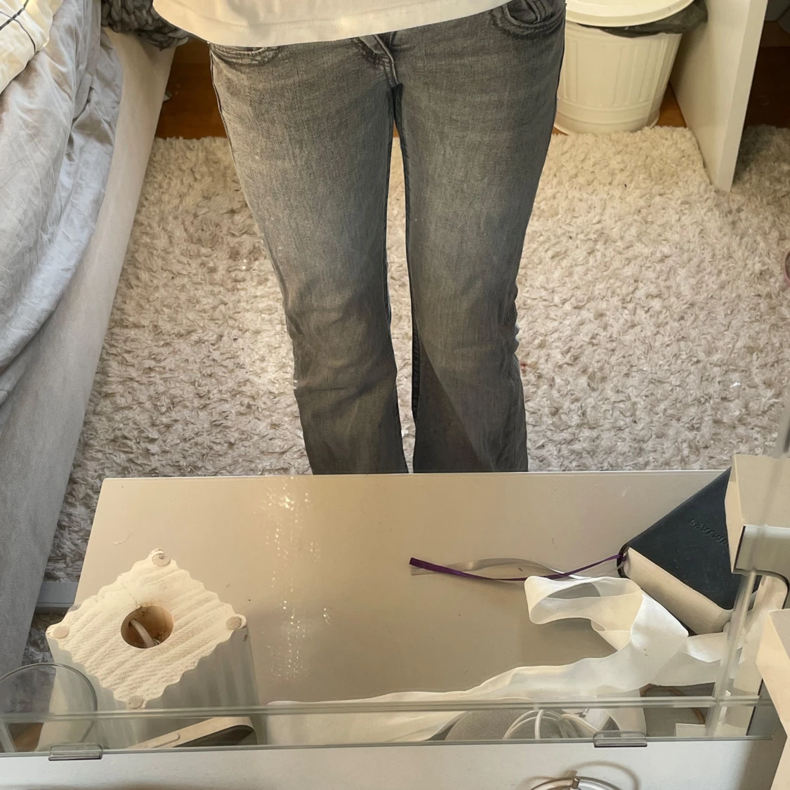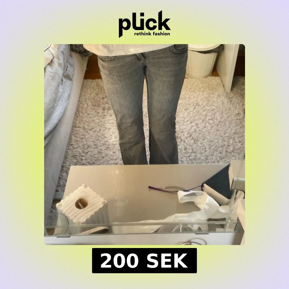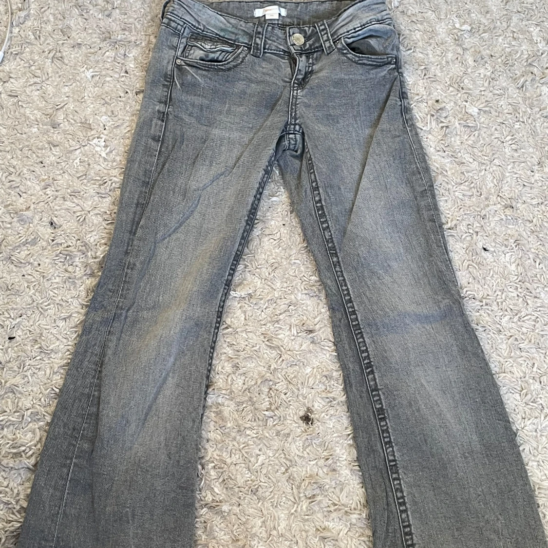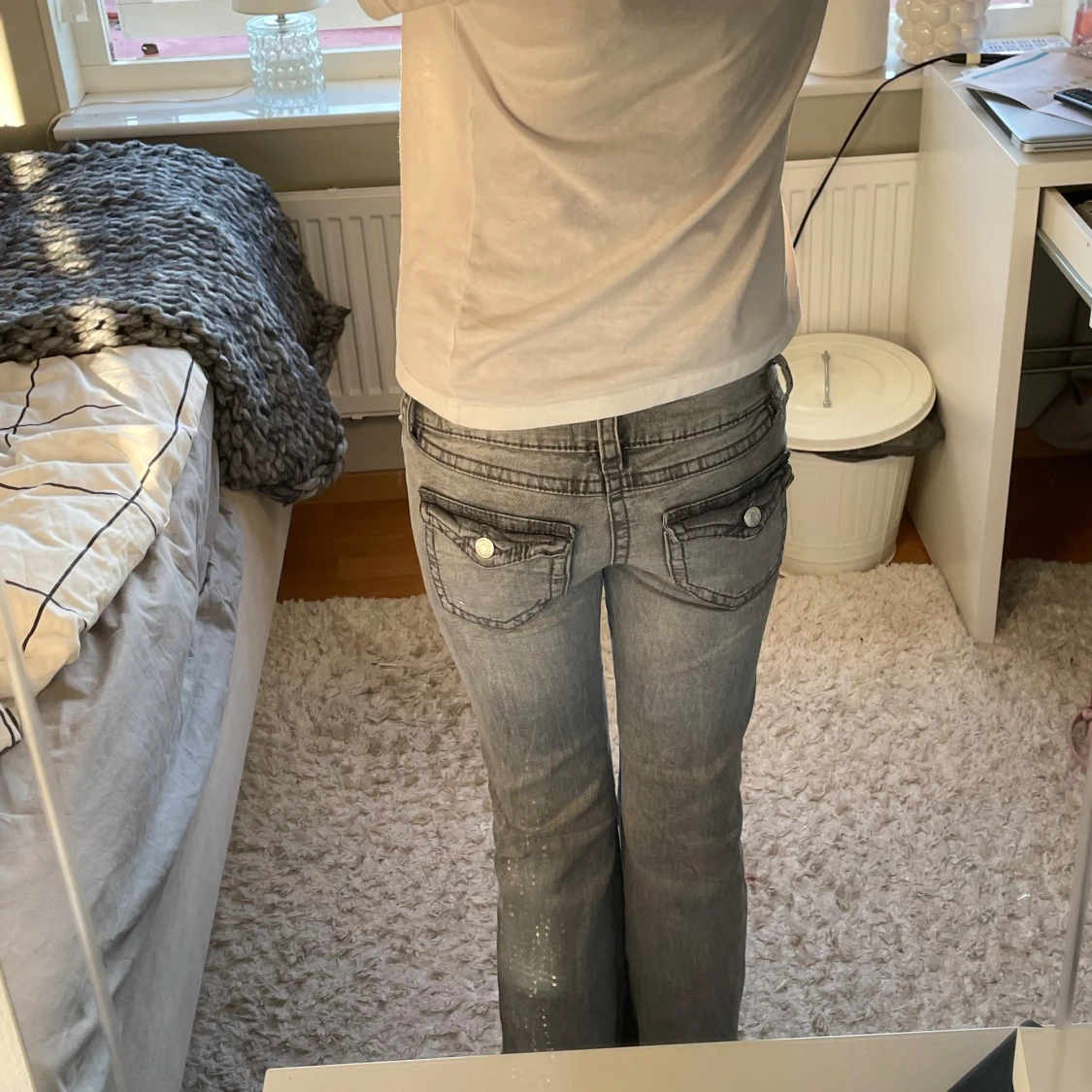 Snygga grå jeans från Gina Tricot i storlek 146. Modellen har bootcut-ben och lowrise. Detaljerade fickor både fram och bak!🤍🩷