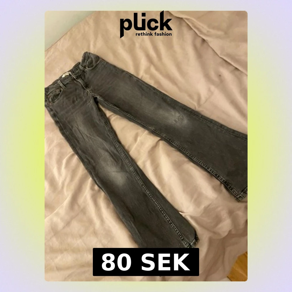 Snygga grå jeans från Gina Tricot i bootcut-modell med klassisk femficksdesign och slitna detaljer vid benslut. Jeansen har knappstängning och bälteshällor, tillverkade i mjukt jeanstyg som ger en cool vintagekänsla. Jeansen har ett igensytt hål på ena knät men syns knappt.💕