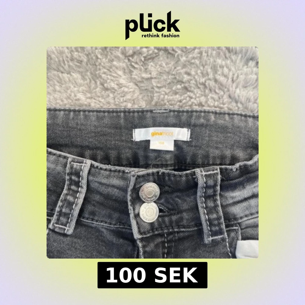 Snygga svartgrå jeans från Gina Tricot i storlek 158. Modellen har bootcut-ben, klassiska fem fickor och dubbla silverfärgade knappar i midjan. Jeansen har en tvättad look och är tillverkade i mjukt jeanstyg med skön passform.