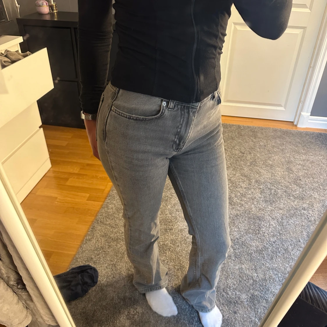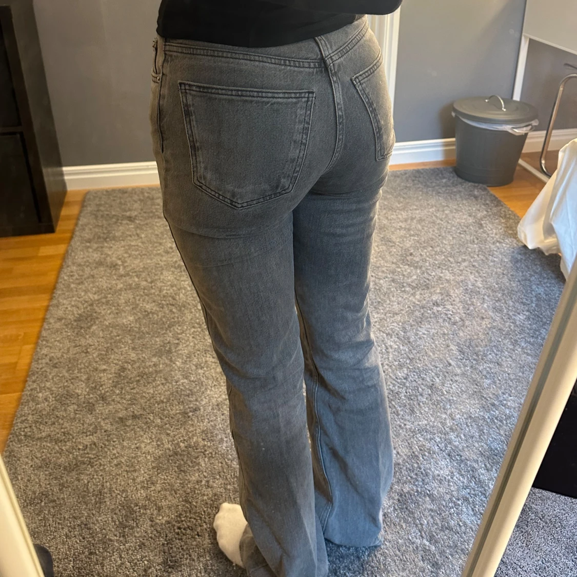 Säljer ett par gråa bootcut jeans från Perfect Jeans i storlek 34. Jeansen har klassisk femficksdesign, hög midja och är tillverkade i mjukt denimtyg. Snygg passform med lätt utsvängda ben och bälteshällor i midjan.