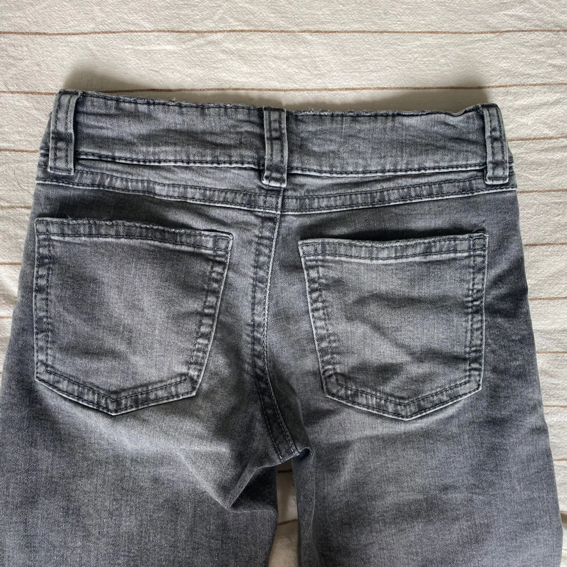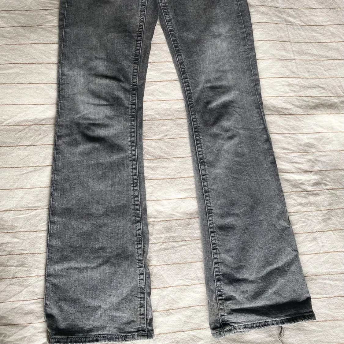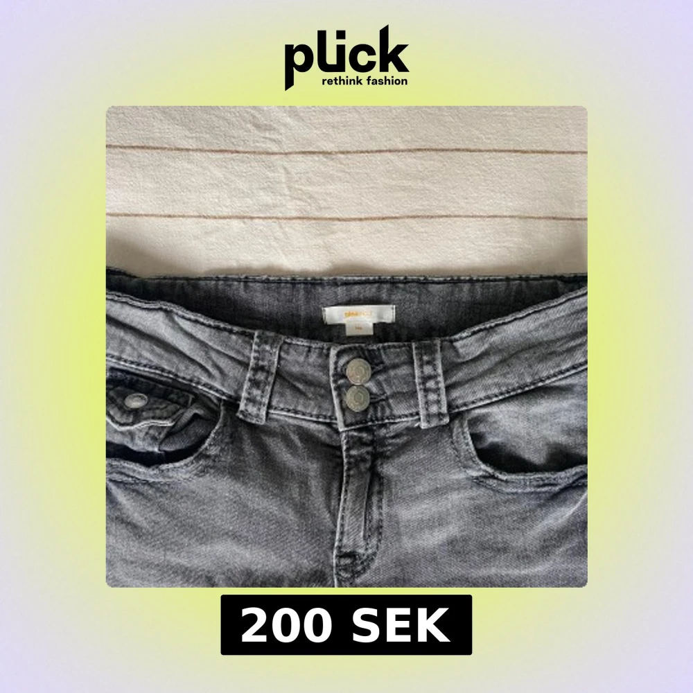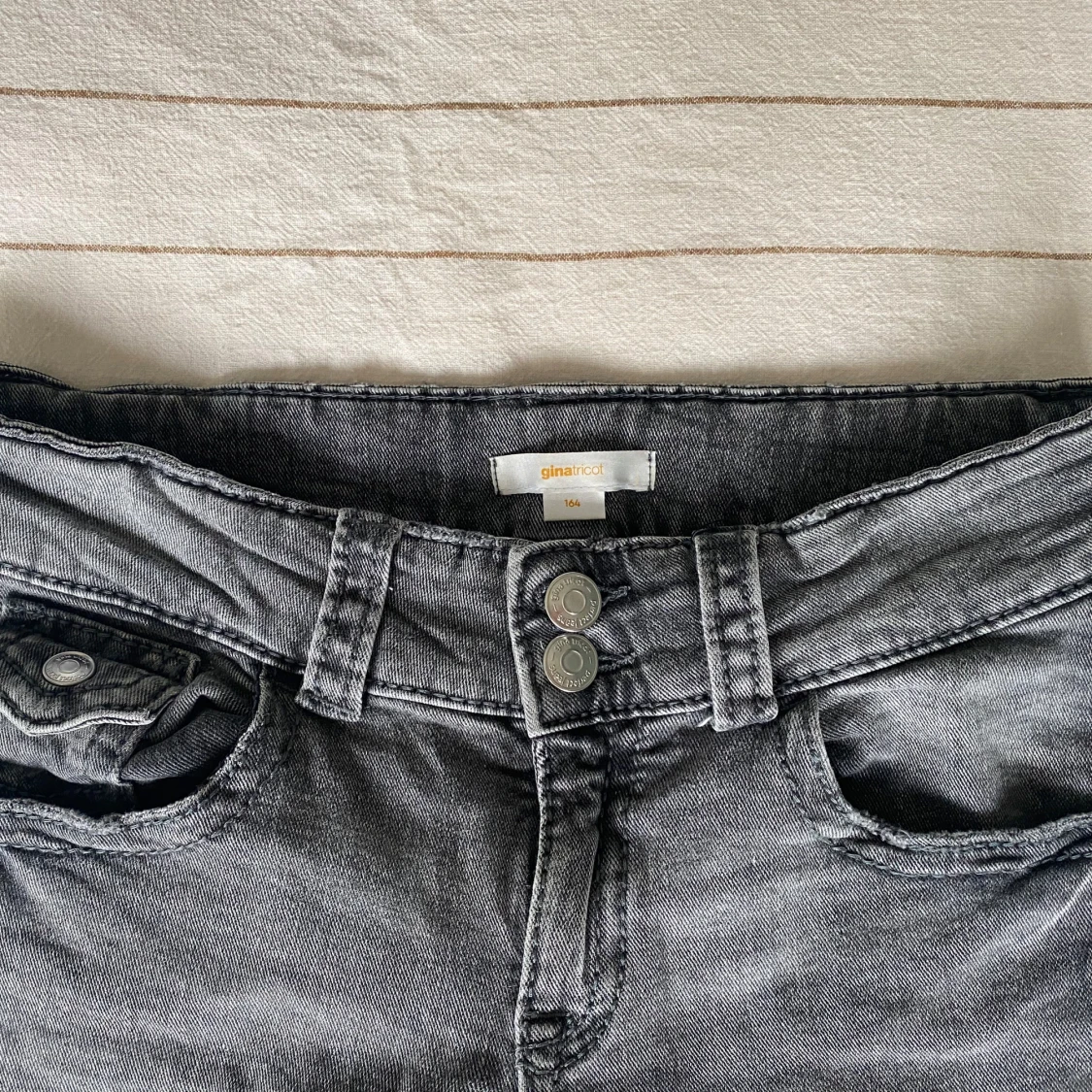 Snygga grå jeans från Gina Tricot i bootcut-modell. Jeansen har låg midja, klassiska fem fickor och dubbla knappar framtill. Tillverkade i mjukt denimtyg med lätt tvättad look. Perfekta för dig som gillar en avslappnad men trendig stil.