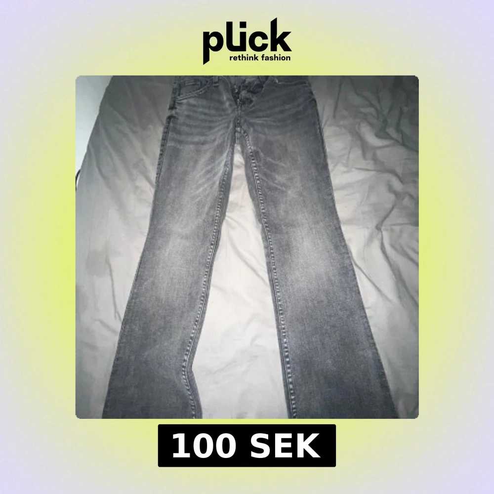 Snygga grå jeans från H&M Divided med bootcut passform. Jeansen har klassisk femficksdesign, dragkedja och knapp framtill samt coola detaljer på bakfickorna. Perfekta för dig som gillar en avslappnad men trendig look.