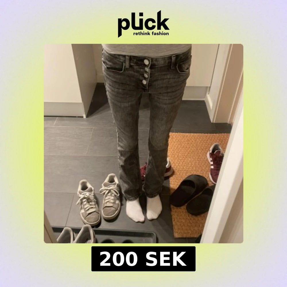 Säljer ett par grå bootcut jeans från H&M i storlek 146. Jeansen har låg midja, justerbar midja och flera knappar framtill. Snygg tvättad grå färg och klassisk femficksmodell. Perfekta för dig som gillar en avslappnad men trendig look.