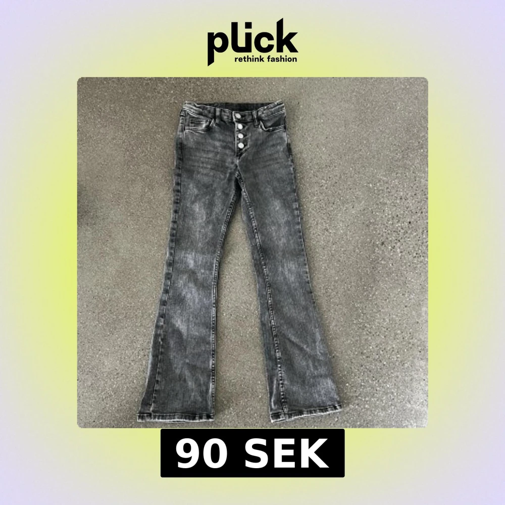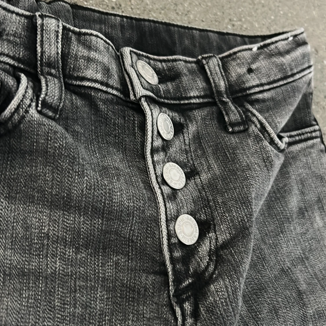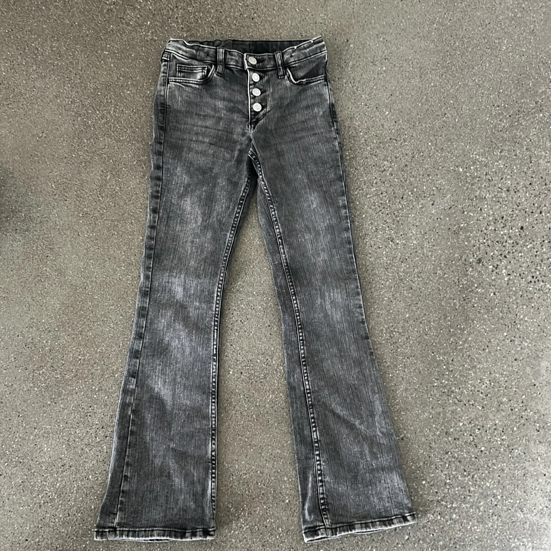 Snygga grå jeans från H&M i bootcut-modell och fyrasilverfärgade knappar framtill. Perfekta för dig!