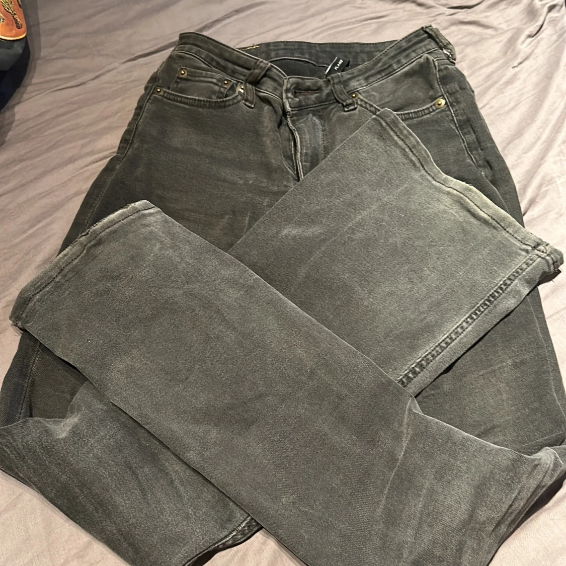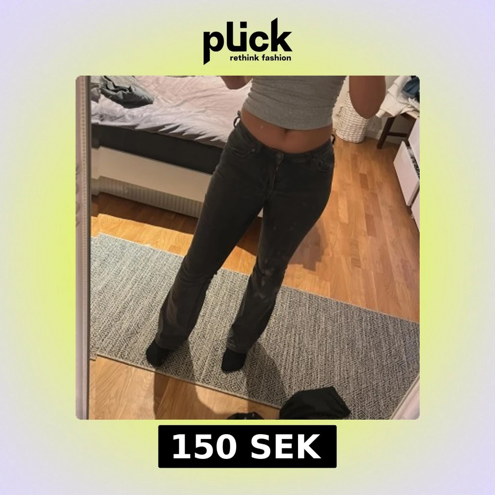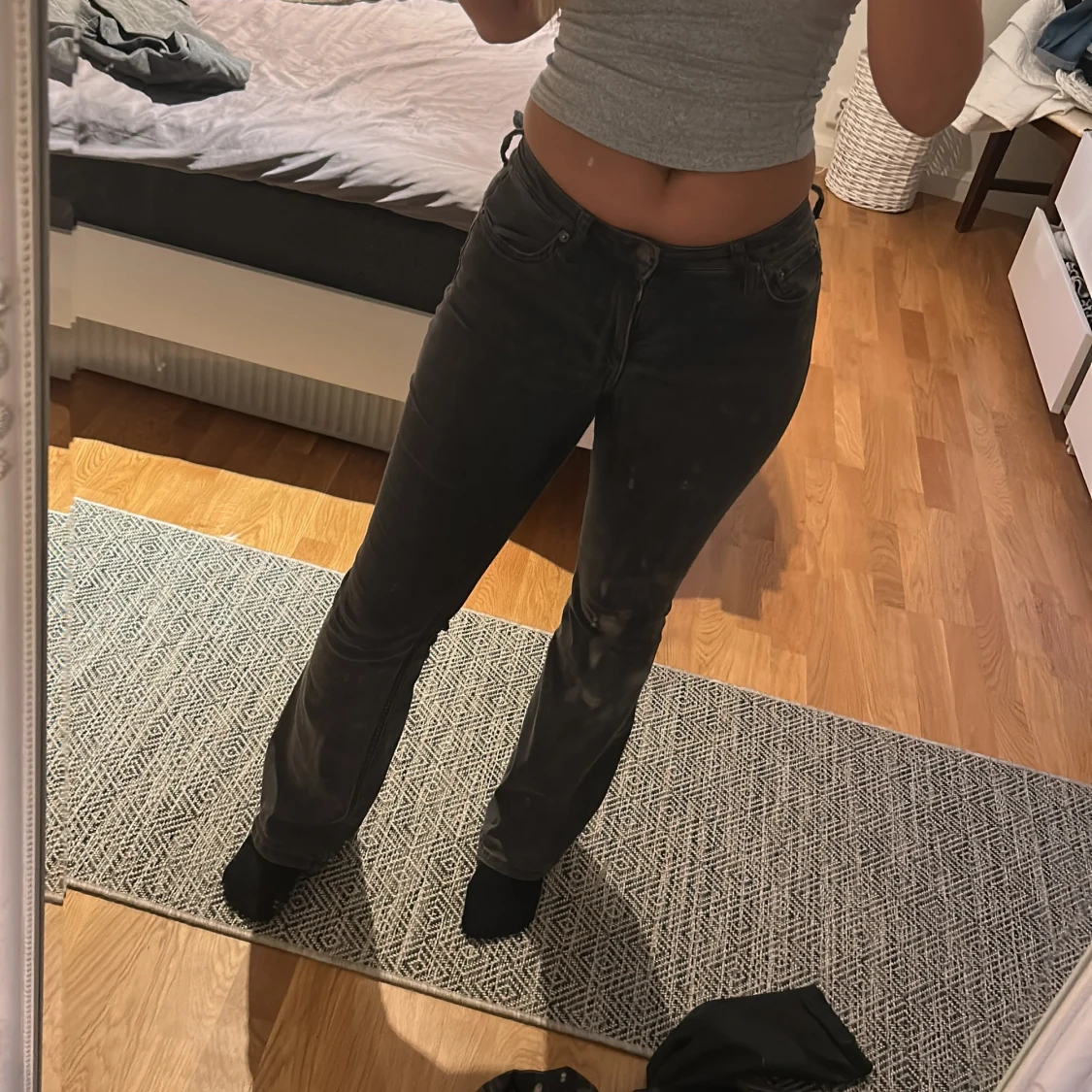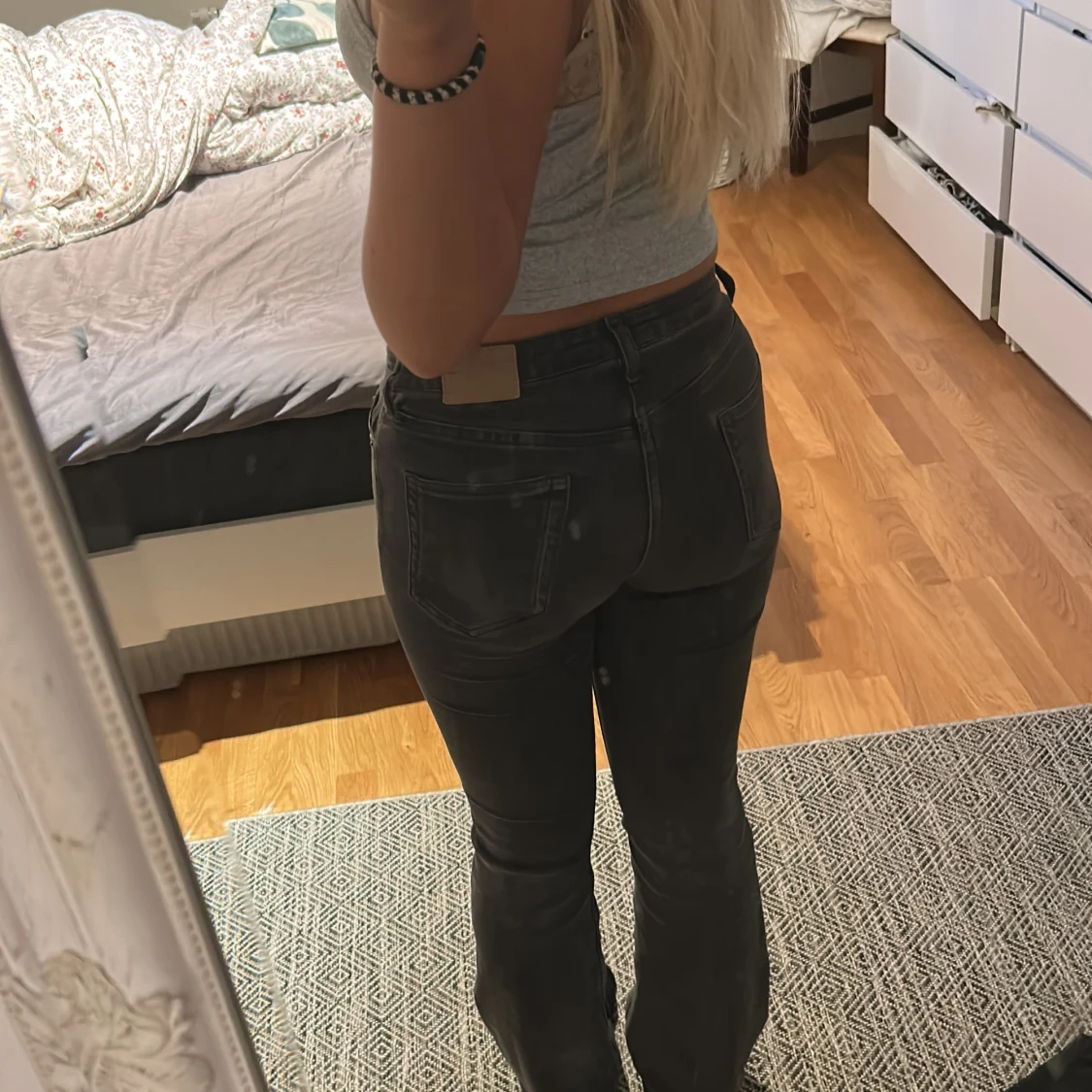 Säljer ett par gråa bootcut jeans från Weekday i modellen Flame low. Jeansen har låg midja, klassisk femficksdesign och är tillverkade i mjukt jeanstyg. Snygg passform med lätt utsvängda ben och diskret tvättad look. Dock så var de ett hål som jag sydde ihop för ett tag sen men när man har på sig byxorna så syns de it att man har sytt