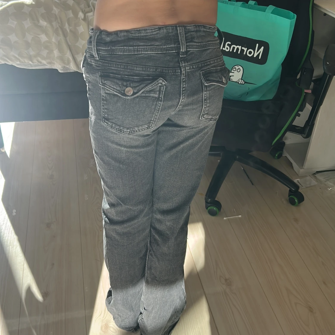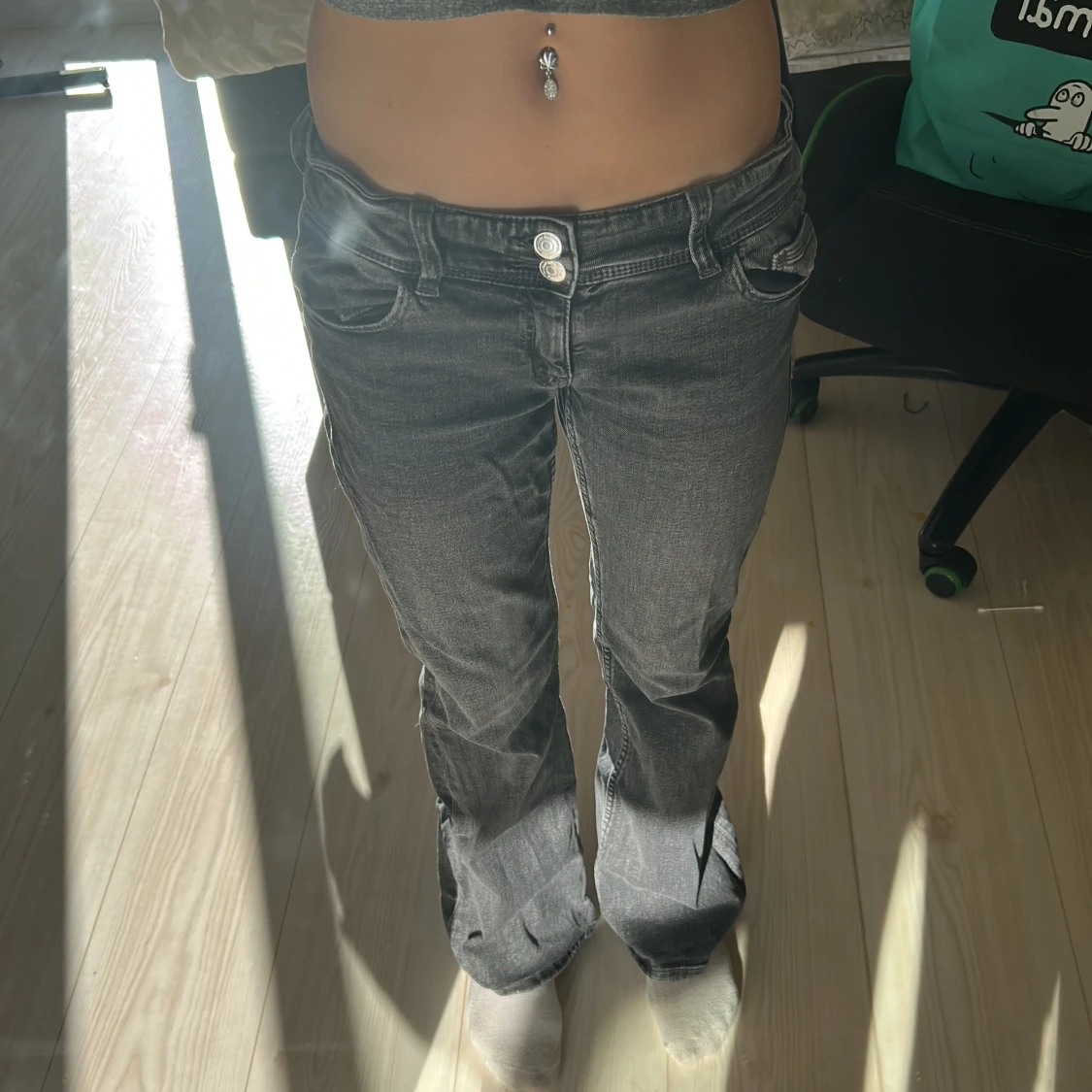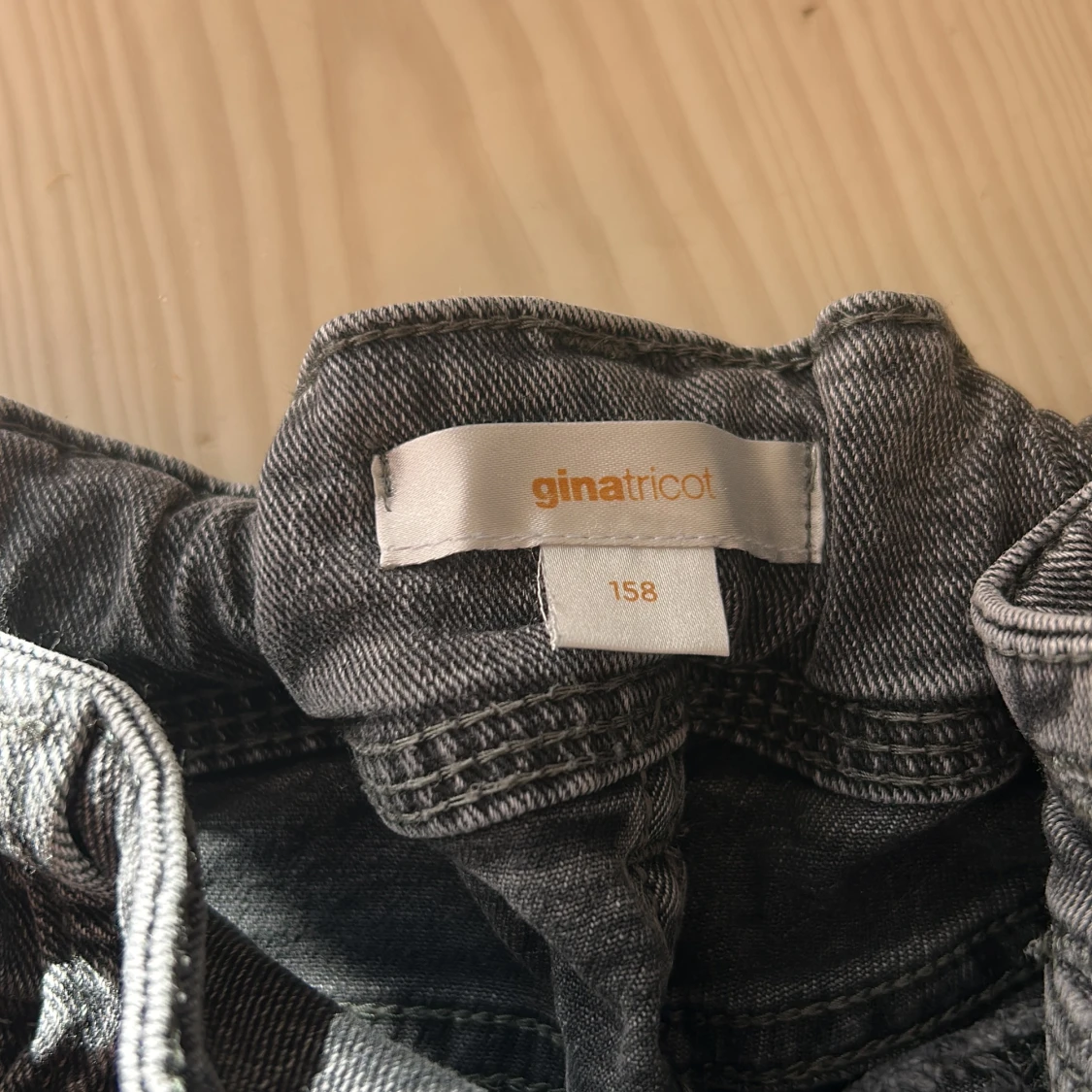 Säljer ett par gråa bootcut jeans från Gina Tricot i storlek 158. Jeansen har låg midja, klassiska fickor fram och bak med snygga detaljer och dubbla knappar i midjan. Perfekta för dig som gillar en avslappnad men trendig look.