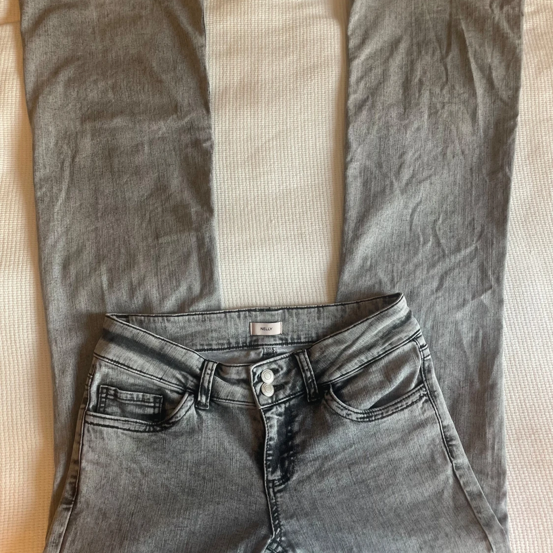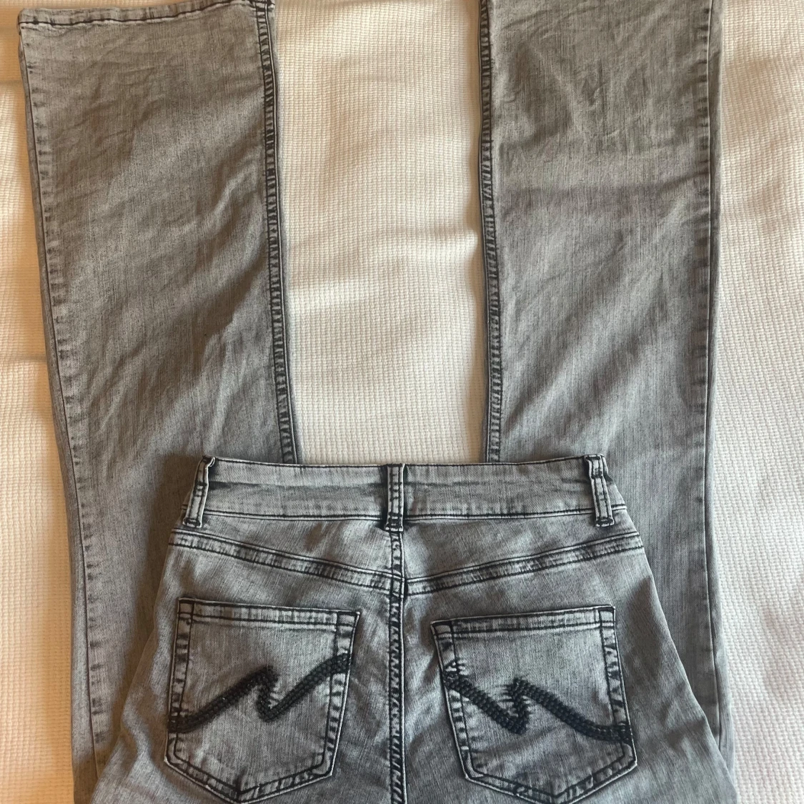 Snygga grå bootcut jeans med unika broderade detaljer på bakfickorna. Jeansen har en klassisk femficksdesign och stängs med dragkedja och knapp. Perfekta för en stilren look.
