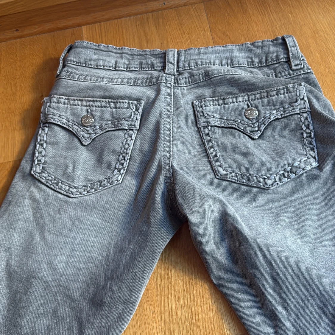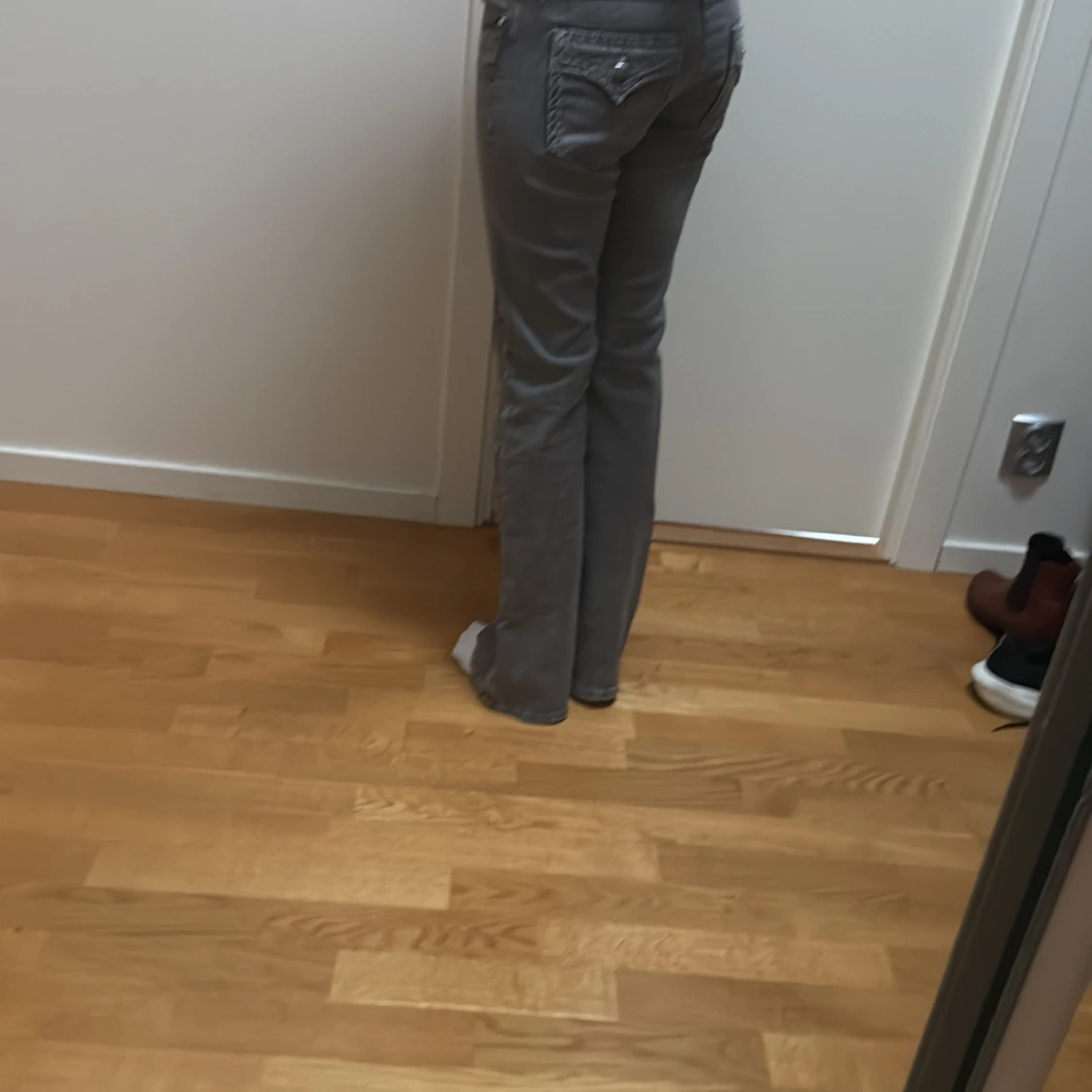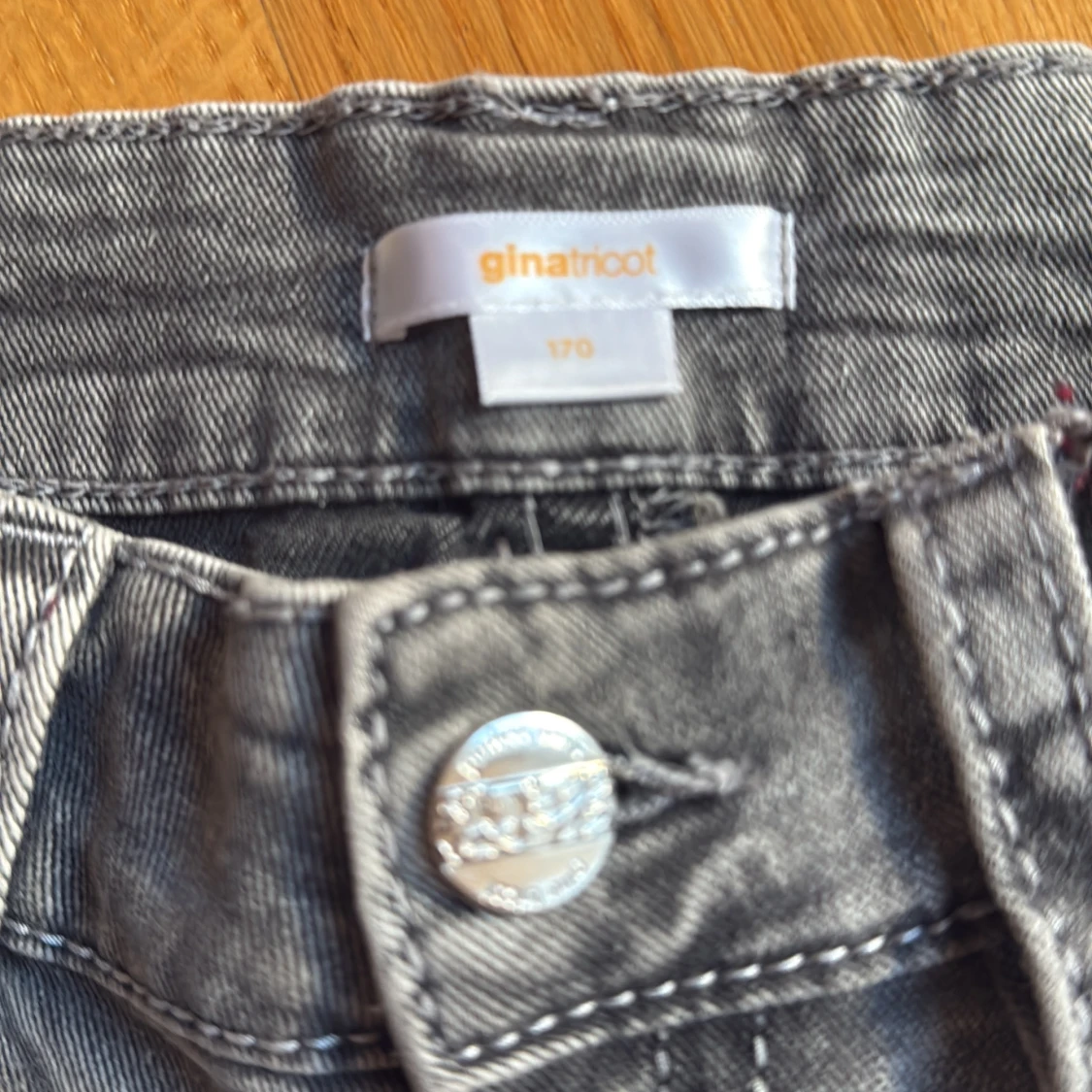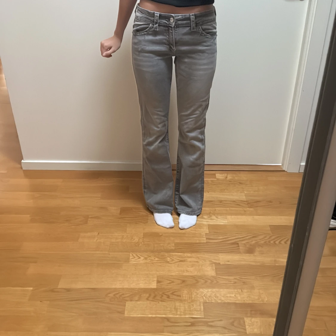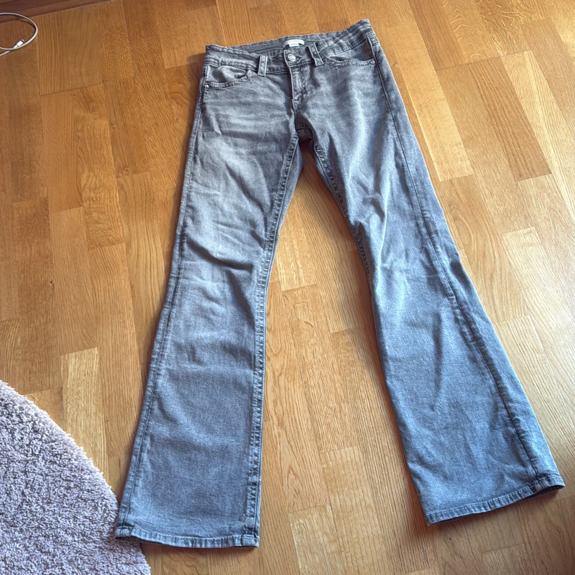 Snygga grå jeans med bootcut-modell och låg midja från Gina tricot. Jeansen har broderade bakfickor med knappdetaljer och klassisk femficksdesign. Tillverkade i mjukt jeanstyg med en lätt tvättad look. Nästan aldrig använda.