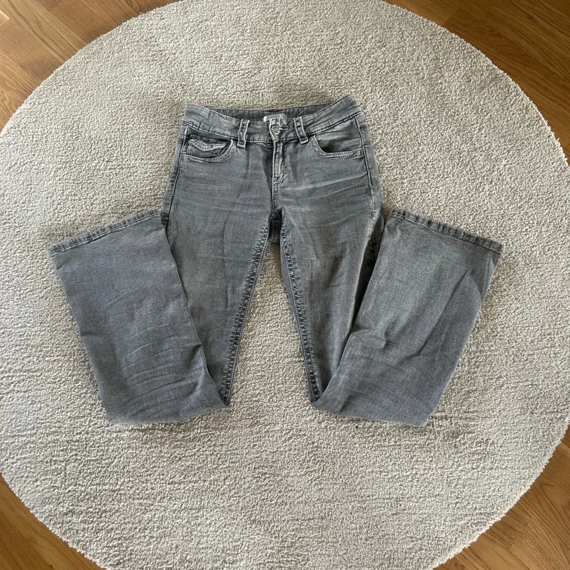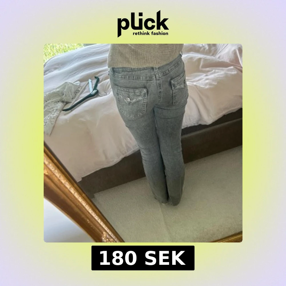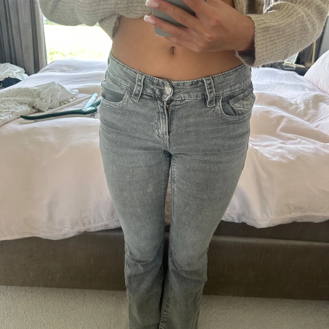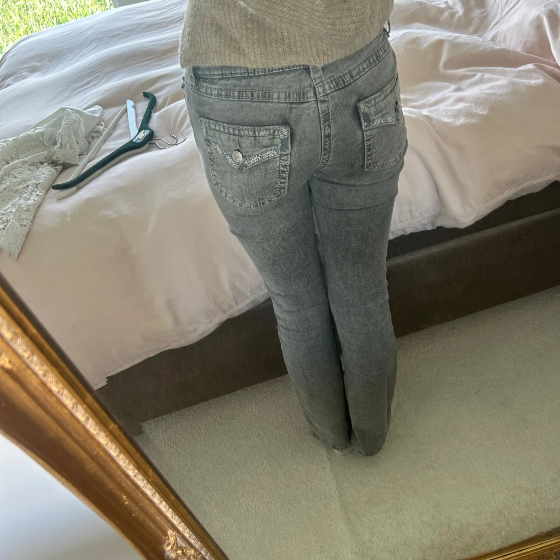 Snygga grå jeans med bootcut-modell och låg midja💕 Jeansen har coola fickor med lock och knapp både fram och bak, samt markerade sömmar som ger en unik look💕hör av dig om det är något💕