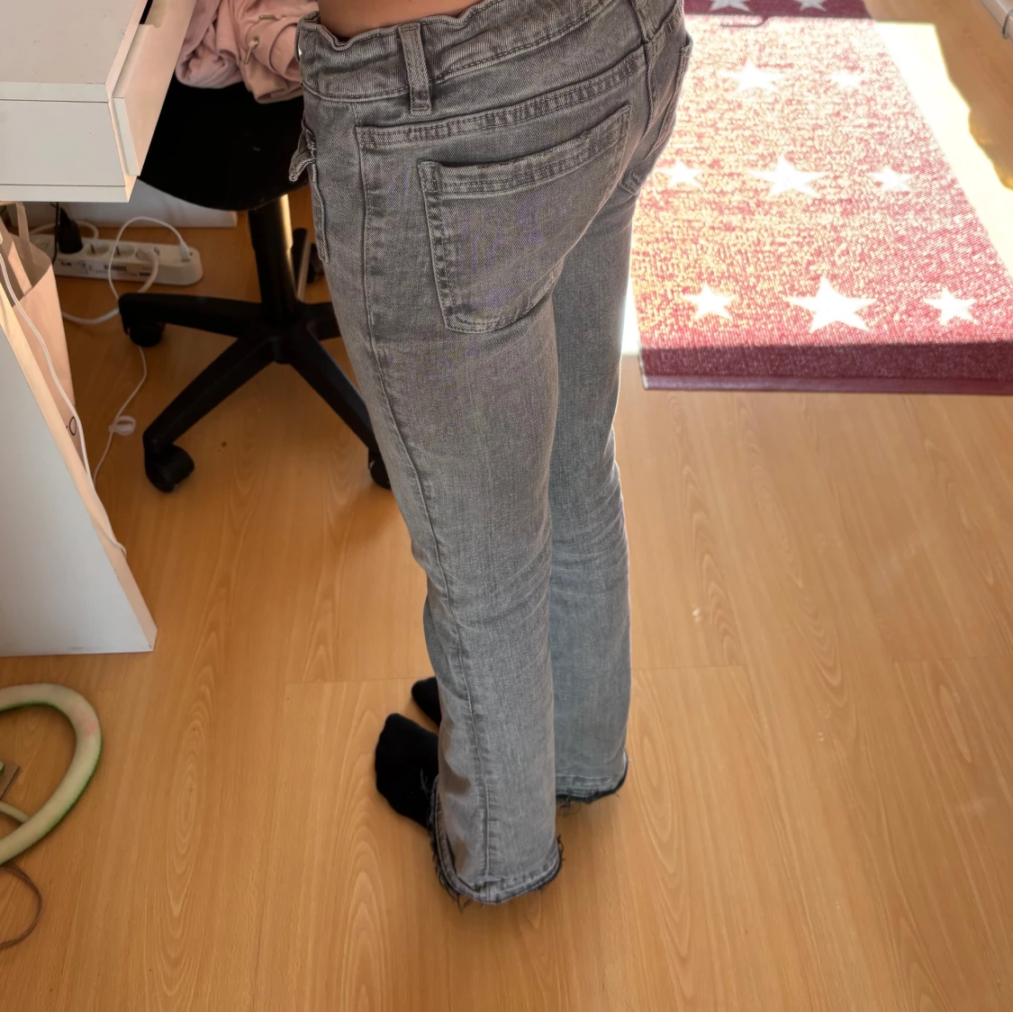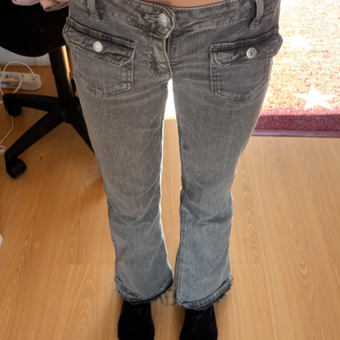 Säljer ett par grå jeans med bootcut passform och snygga fickor framtill med knappar. Jeansen har låg midja och klassisk femficksdesign. Perfekta för dig som gillar en retro vibe och vill ha något som sticker ut lite extra.