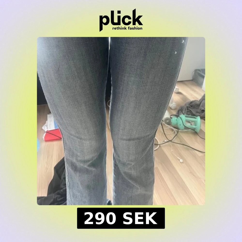 Säljer ett par grå bootcut jeans med snygga nitar på ena sidan upptill. Jeansen har klassisk femficksdesign och normal passform. Perfekta för dig som vill ha en cool och avslappnad stil.