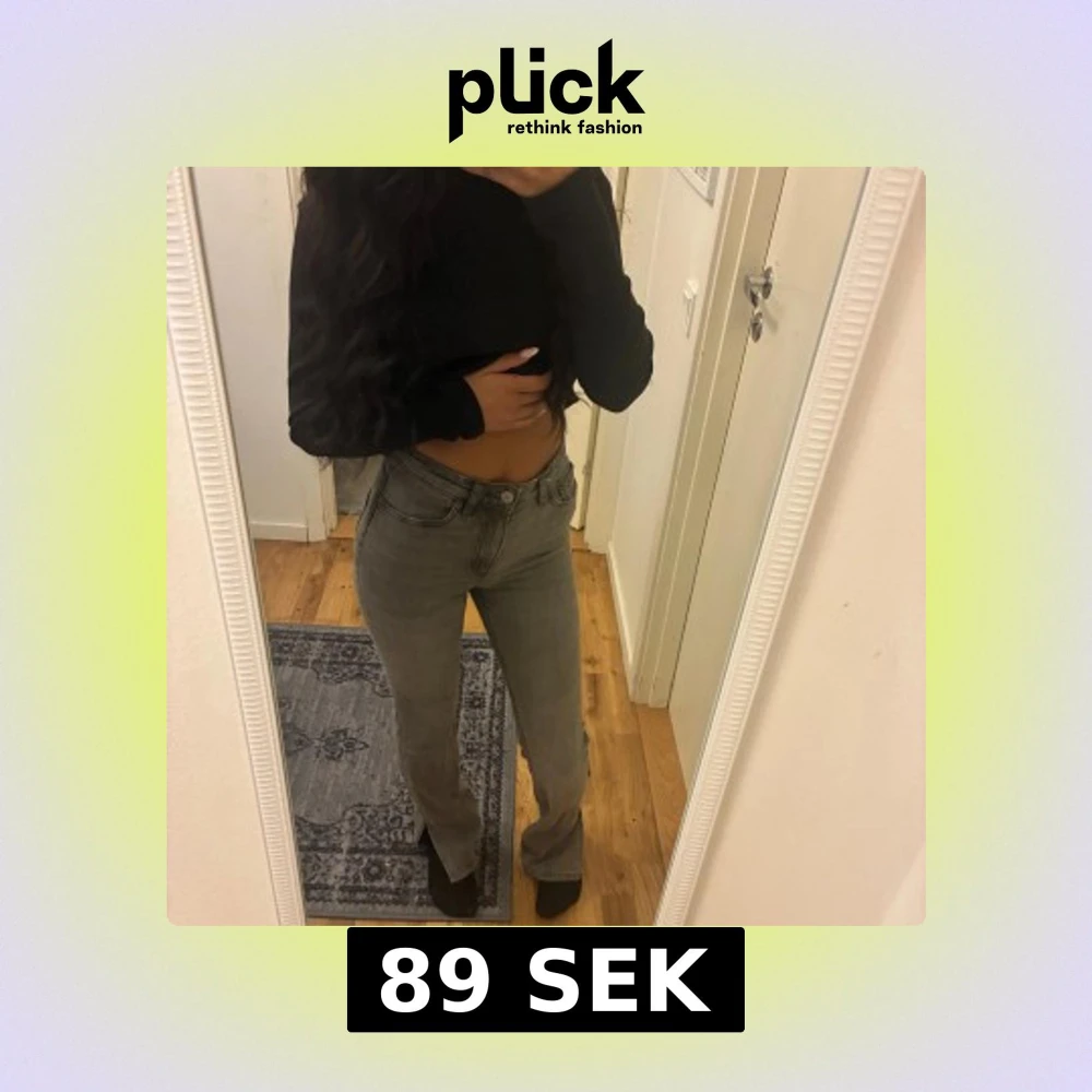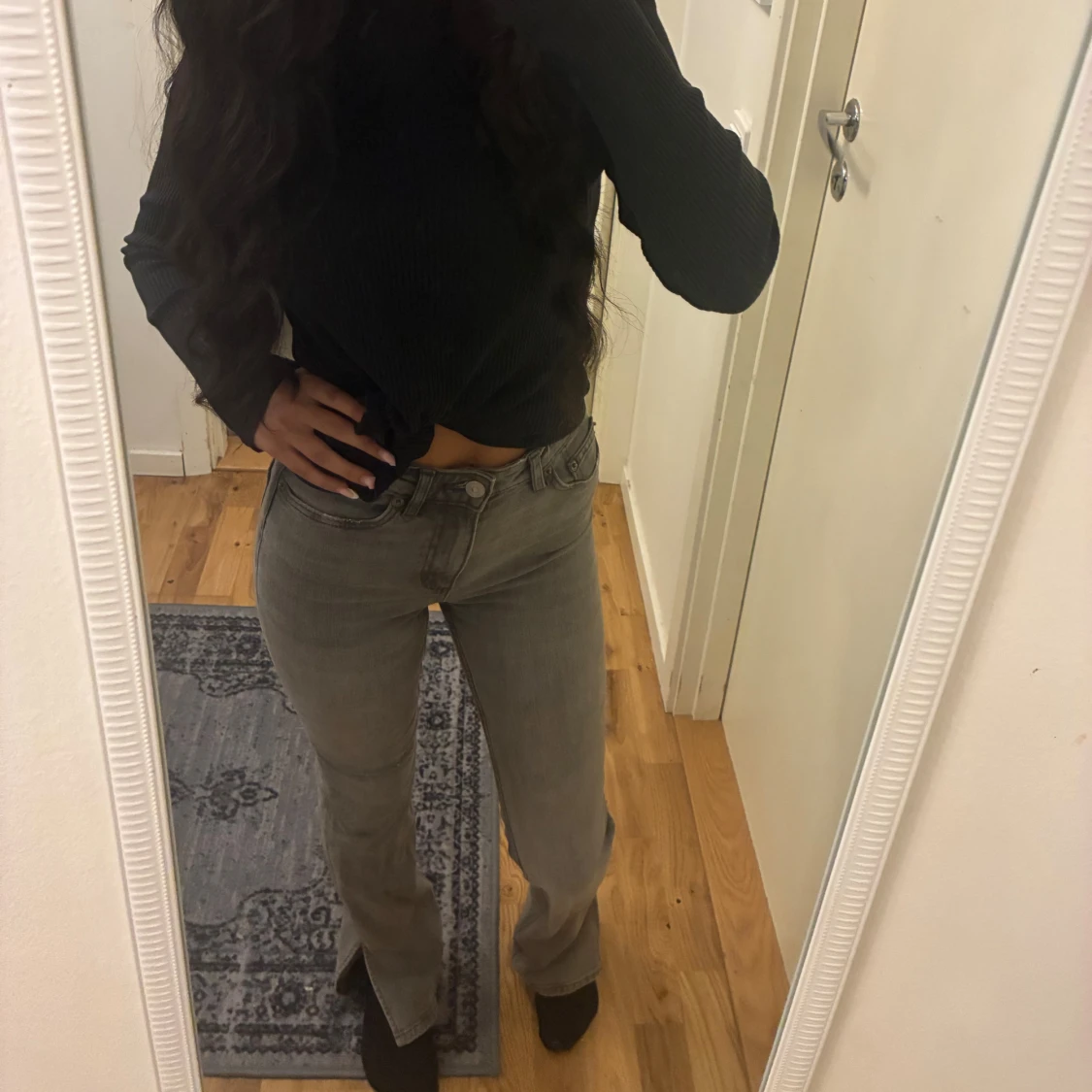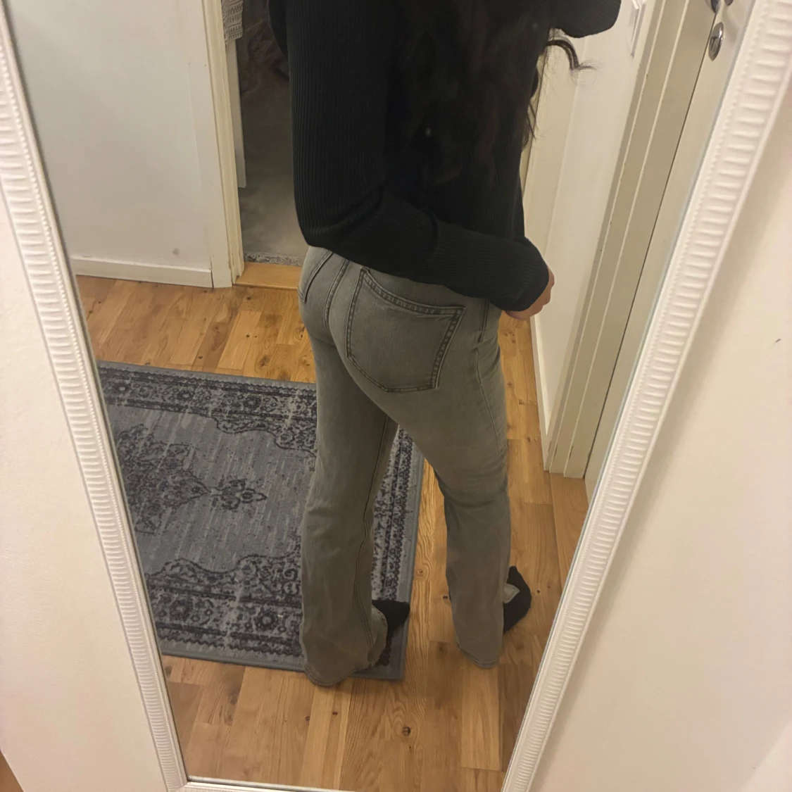Säljer ett par gråa jeans med bootcut-modell och hög midja. Jeansen har klassisk femficksdesign och raka ben som släpper ut lite nertill. Snygg, enkel tvätt och passar perfekt till crop tops eller stickade tröjor. Materialet är jeans och färgen är en snygg ljusgrå ton.