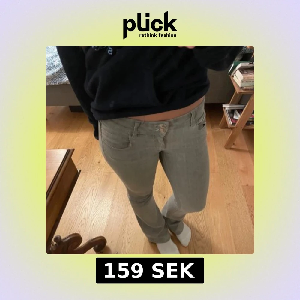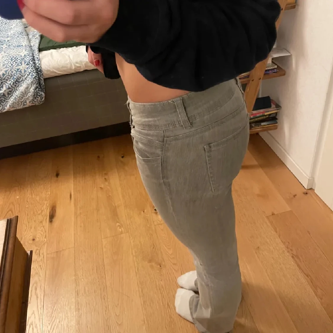 Säljer ett par grå jeans med snygg bootcut och låg midja. Jeansen har klassisk femficksdesign och stängs med dragkedja och knapp.